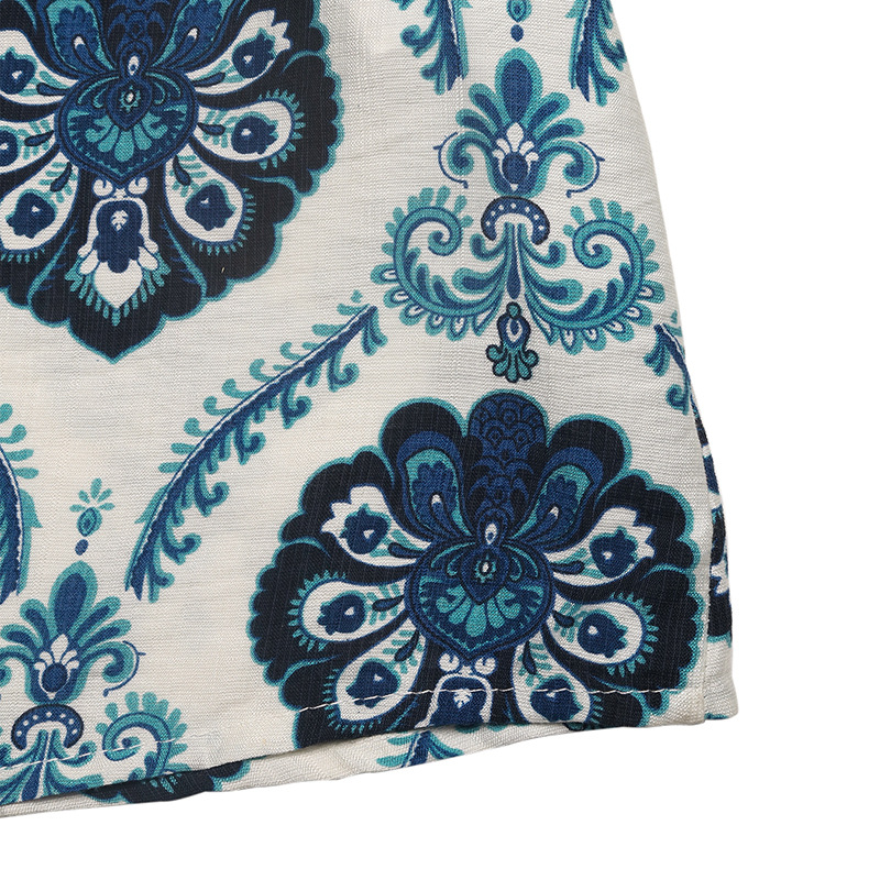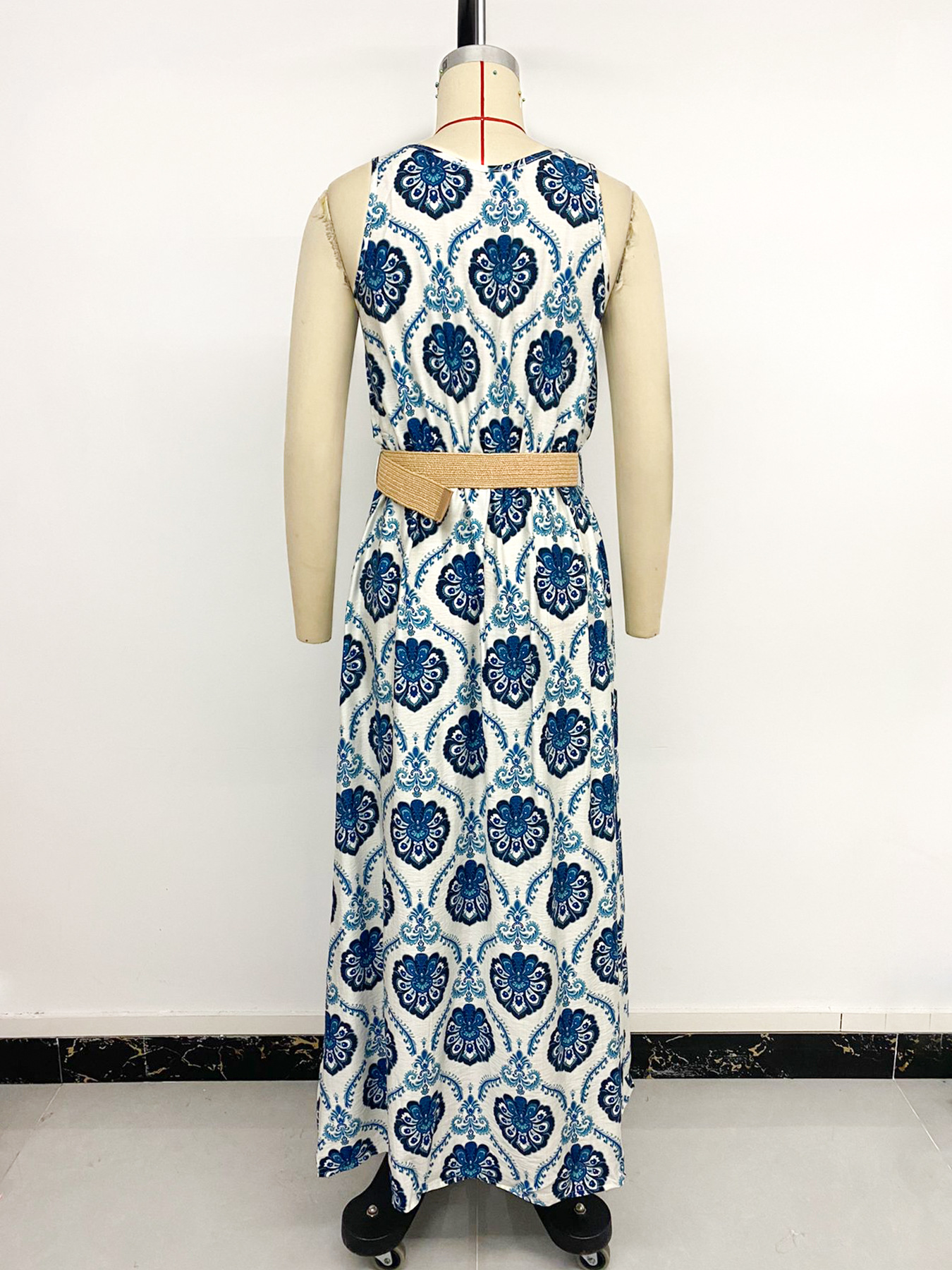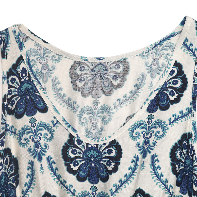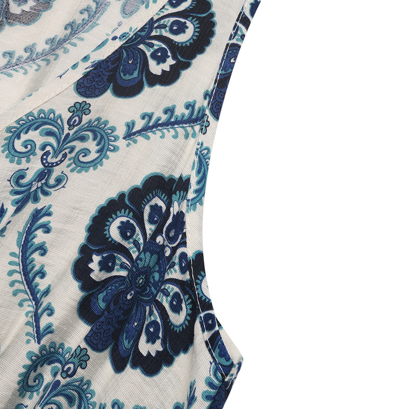 Belt Tight Waist Ethnic Printed V neck Sleeveless Split Dress Women Summer