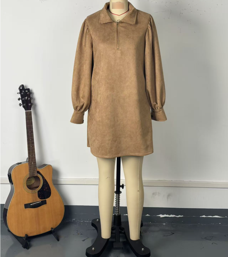 Elegant Solid Color Long Sleeve Zipped Stand Collar Dress Retro