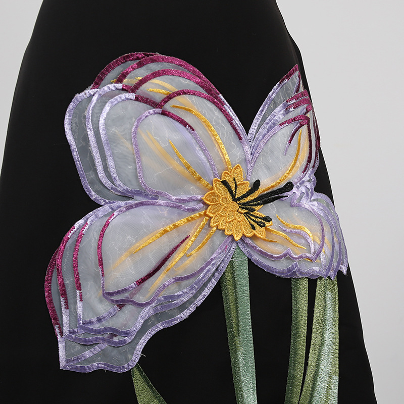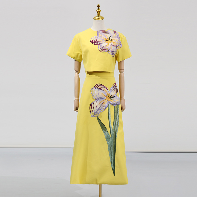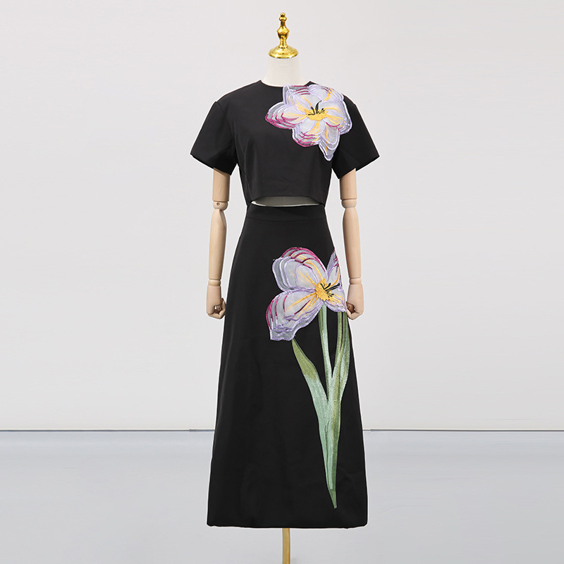 Elegant Summer Retro Waist Controlled Slim Fit Slimming Beautiful Floral Embroidery Design Skirt Two Piece Sets Women