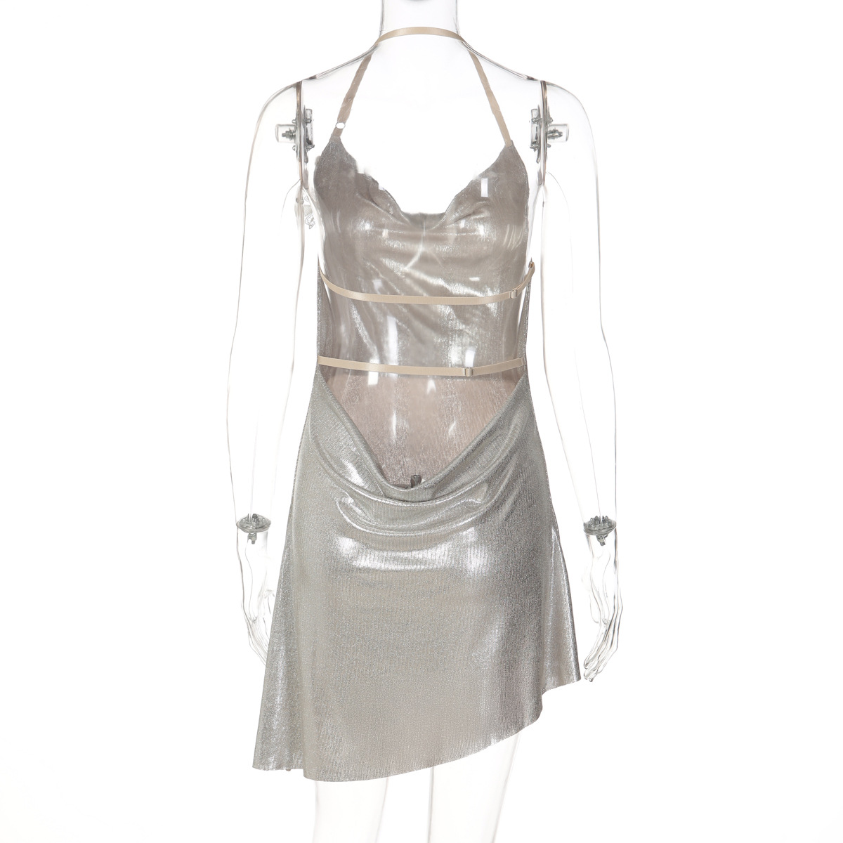 Spring Women Clothing Halter Swing Collar Sexy Backless Bronzing Slim Dress