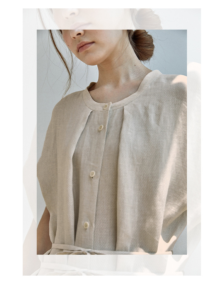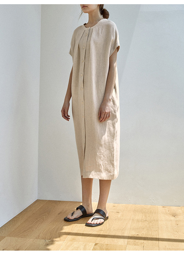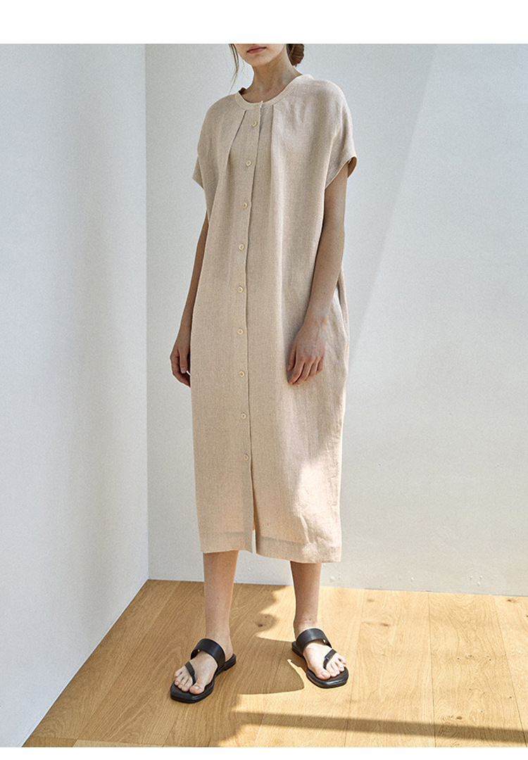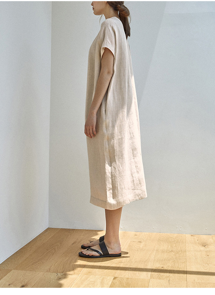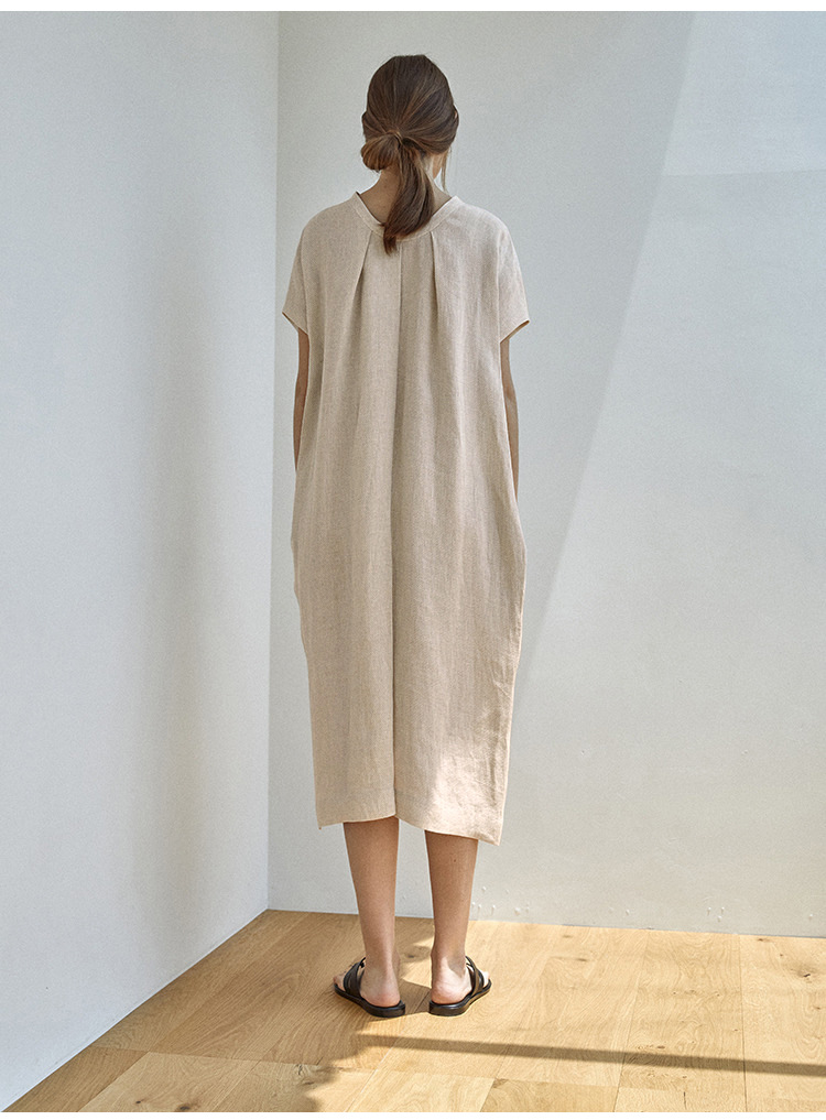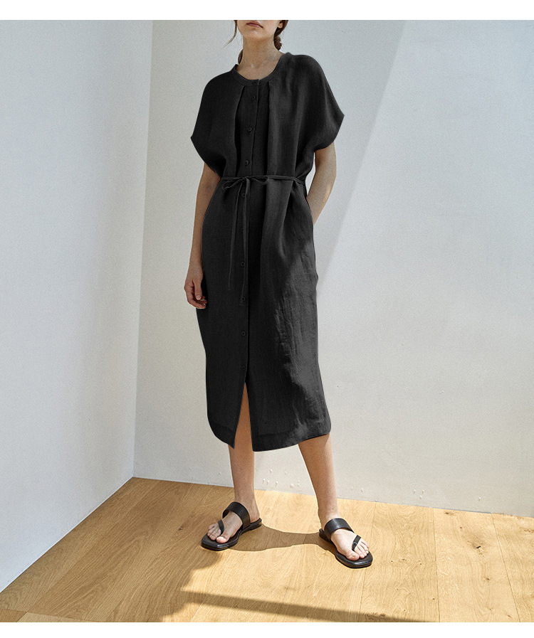 Vestido de verano de lino puro, holgado, con cintura ancha y cordones, midi.