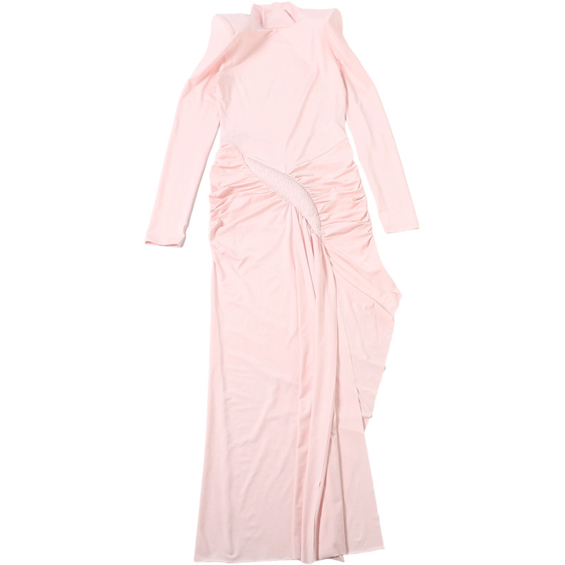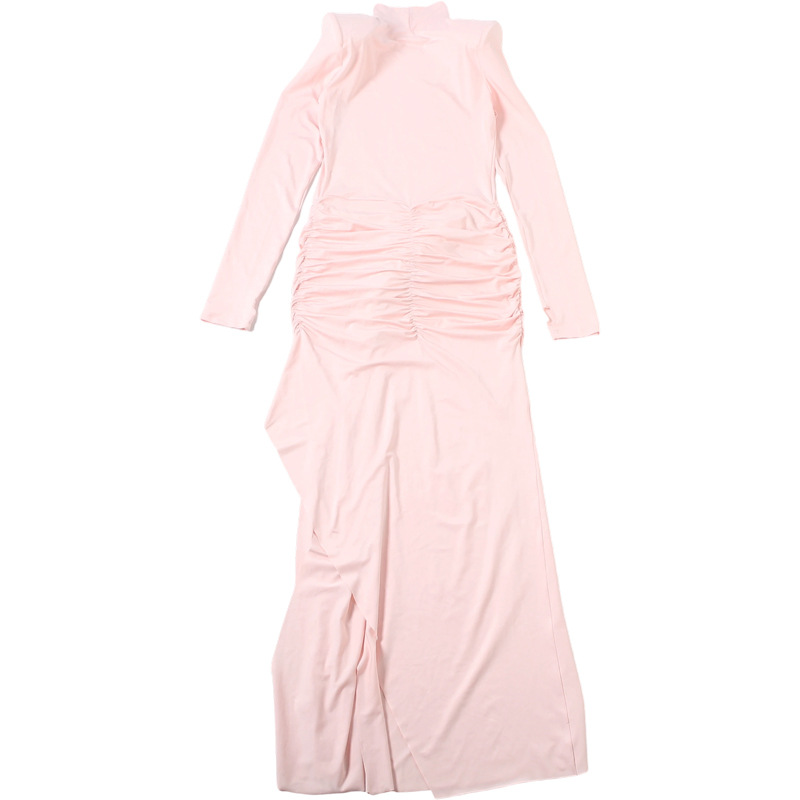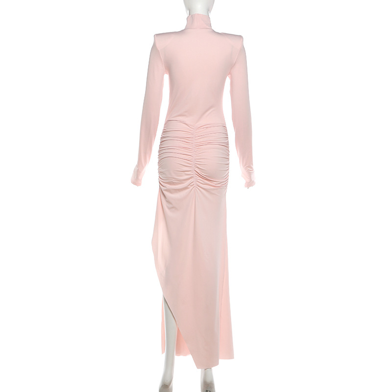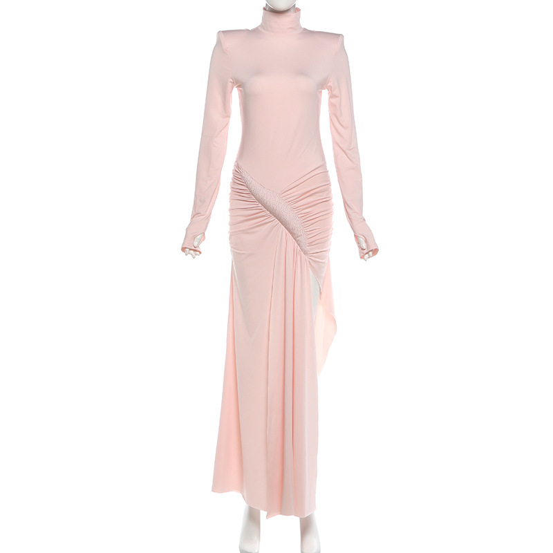 Women Clothing Spring Solid Color Elegant Graceful Turtleneck Waist Tight Split Long Sleeve Dress