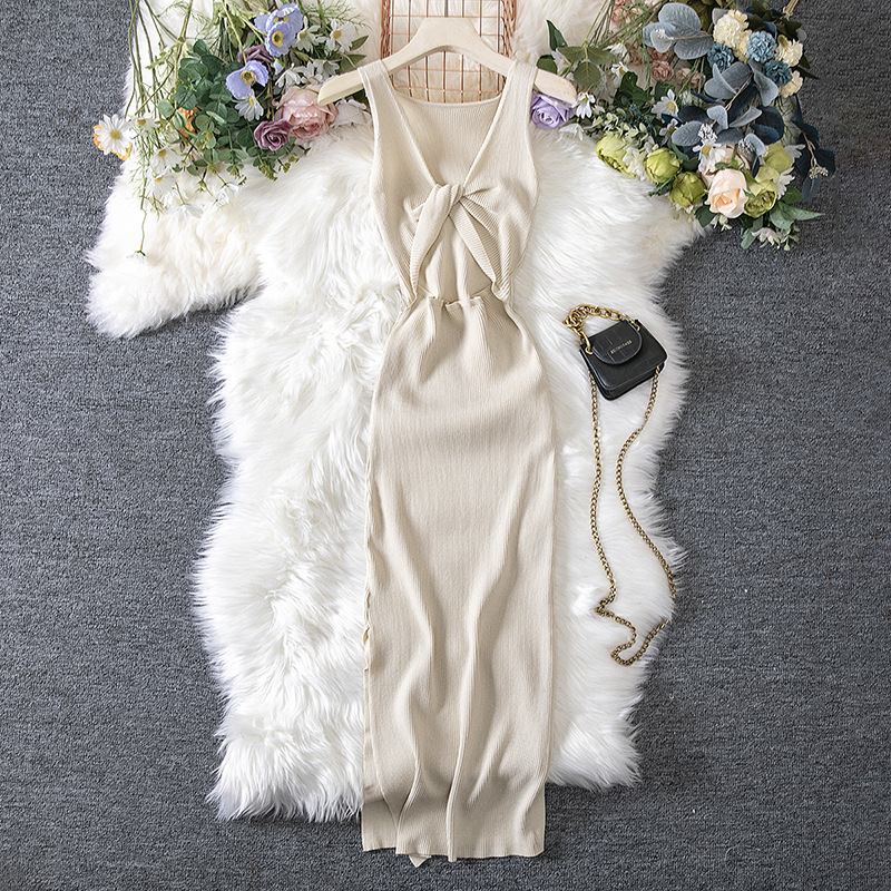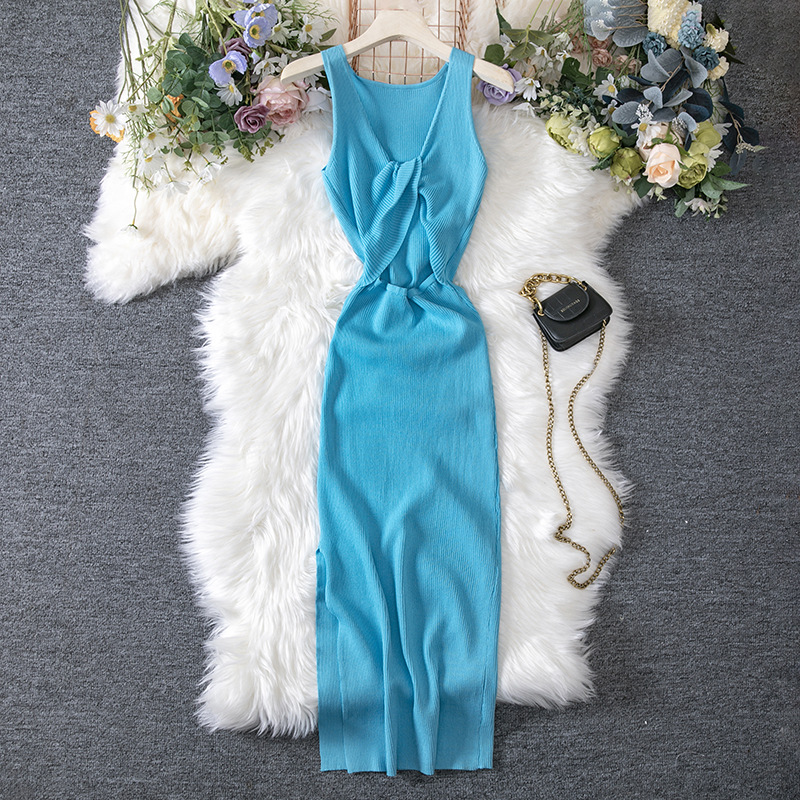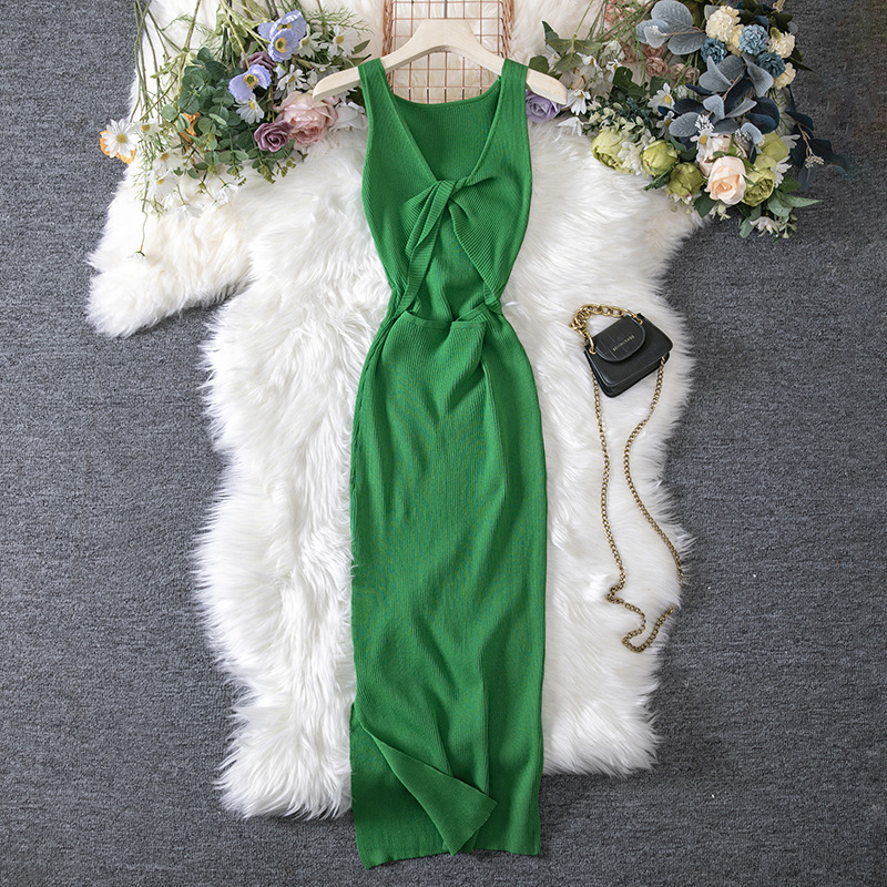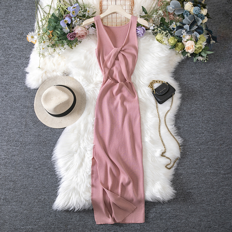 Women Clothing Summer Sexy Kinked Chest Flattering Machine Hollowed Reversible Knitted Dress
