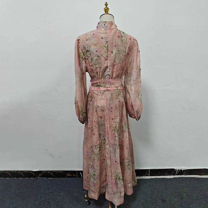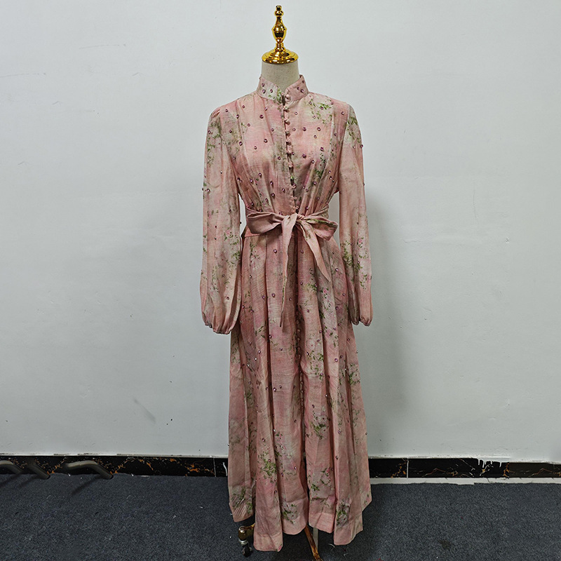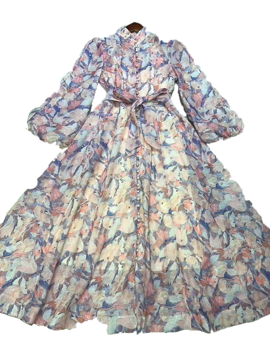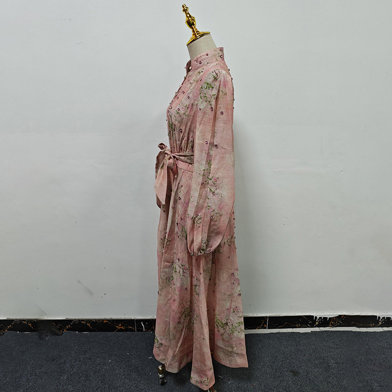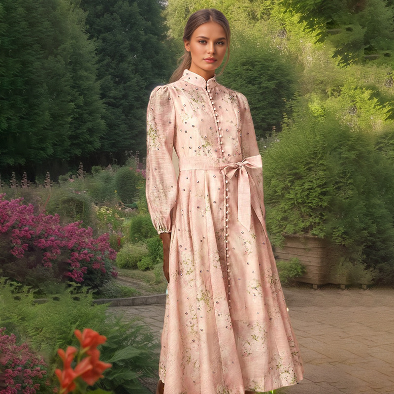 Beautiful Tea Break Dress Spring Summer Small Stand Collar Printed Lace up Waist Slimming Dress Women