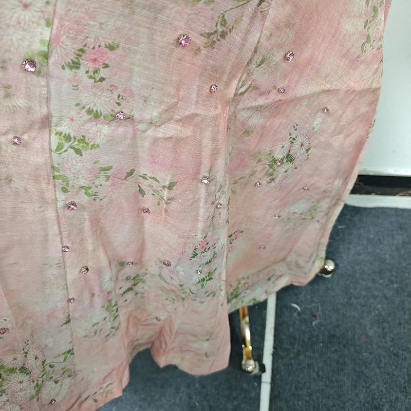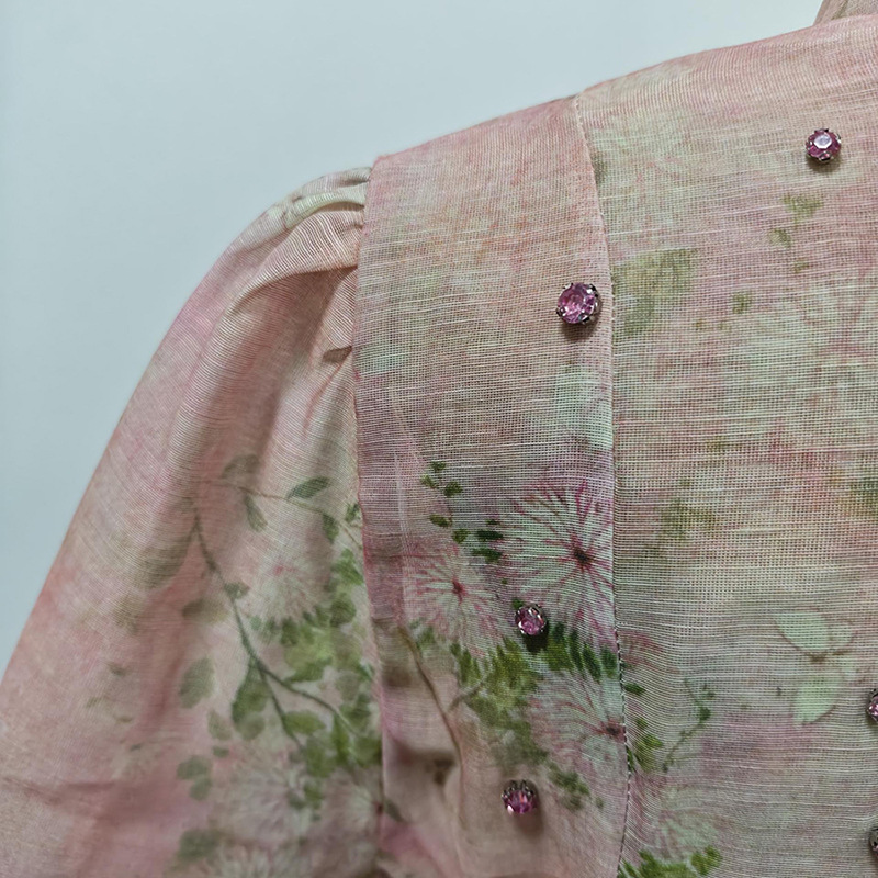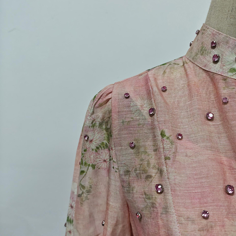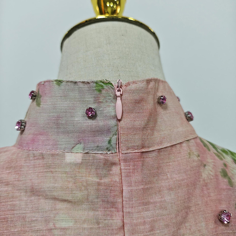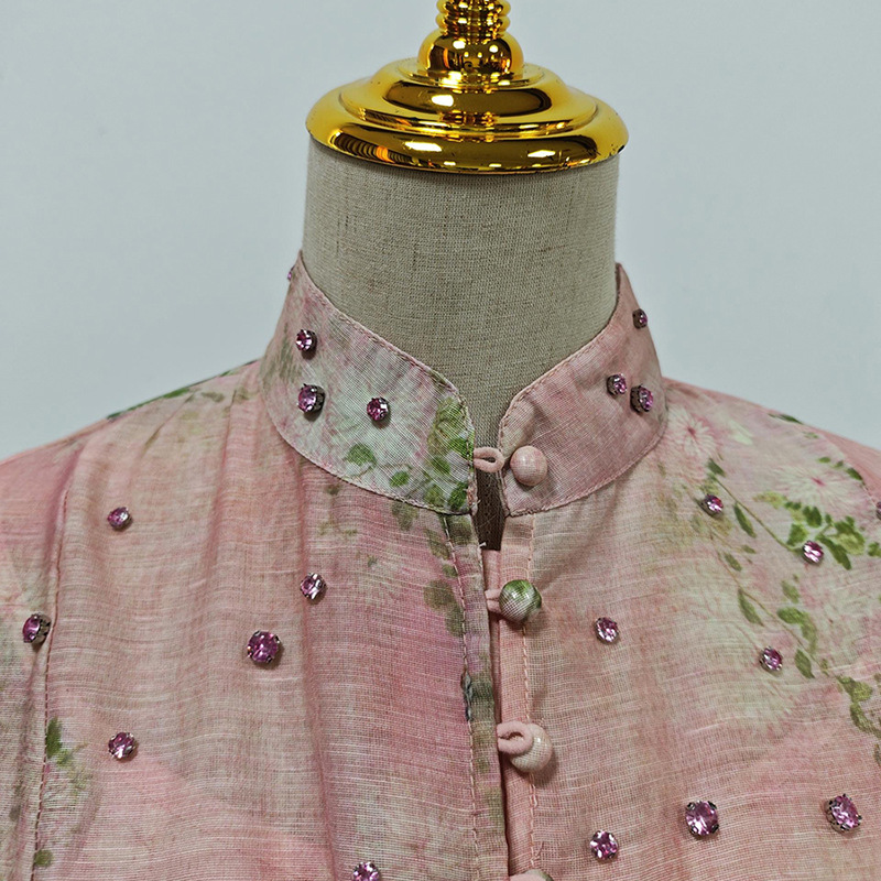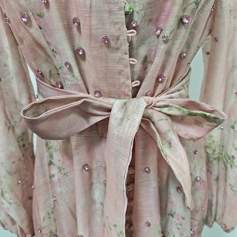 Beautiful Tea Break Dress Spring Summer Small Stand Collar Printed Lace up Waist Slimming Dress Women