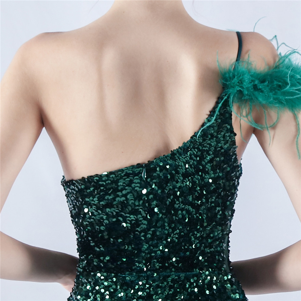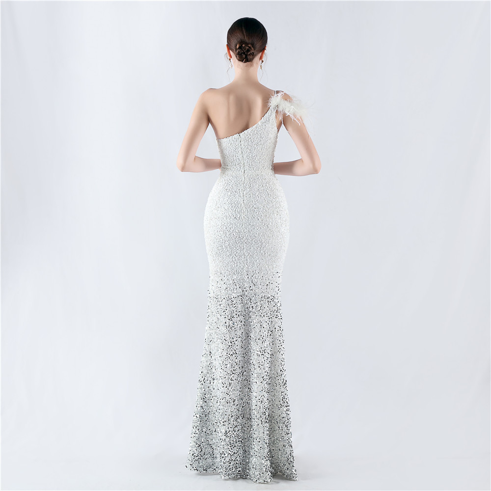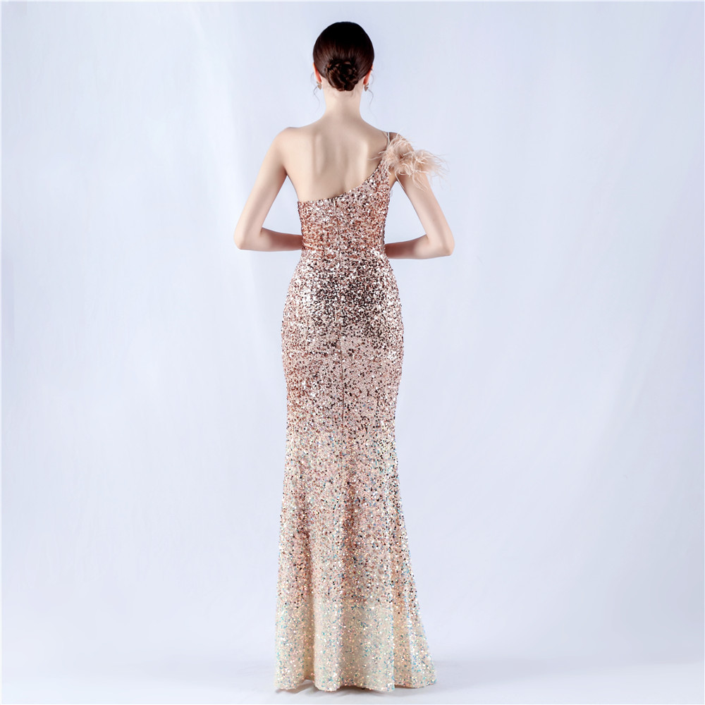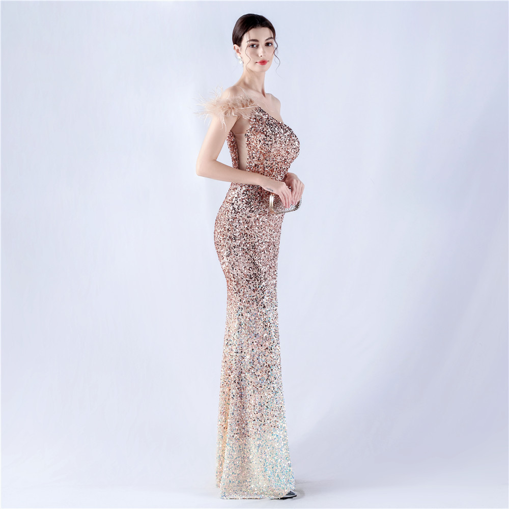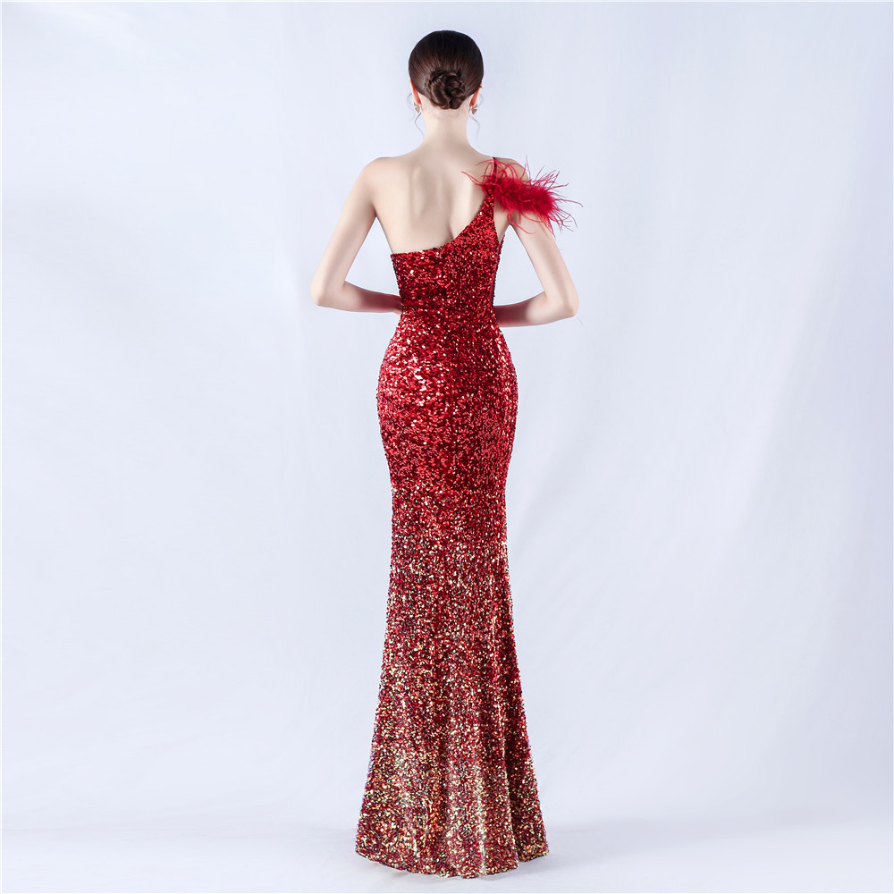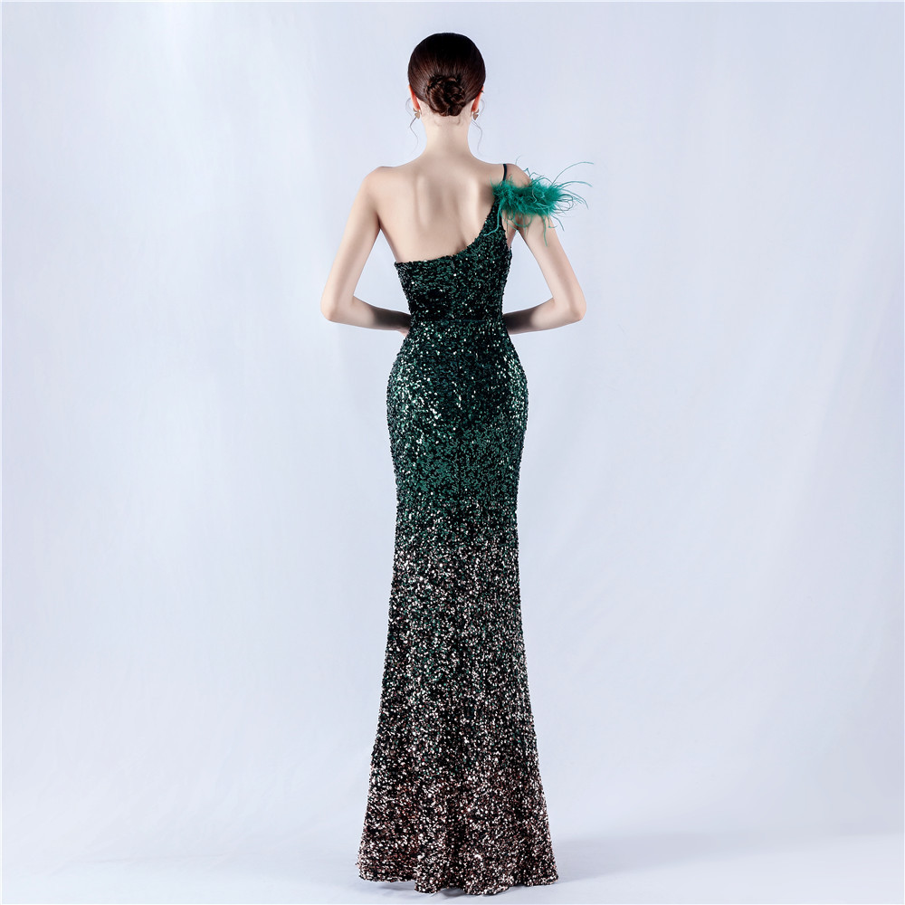 Dress Gradient Velvet Bottom Sequin Craft Order Ostrich Feather One Shoulder Diagonal Collar High Fork Evening Dress