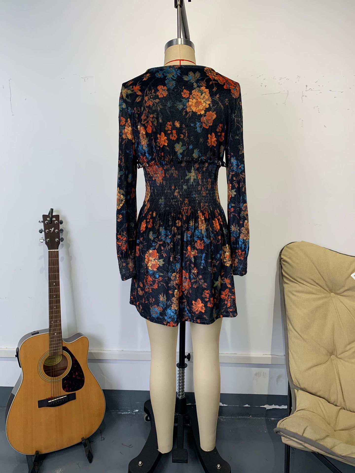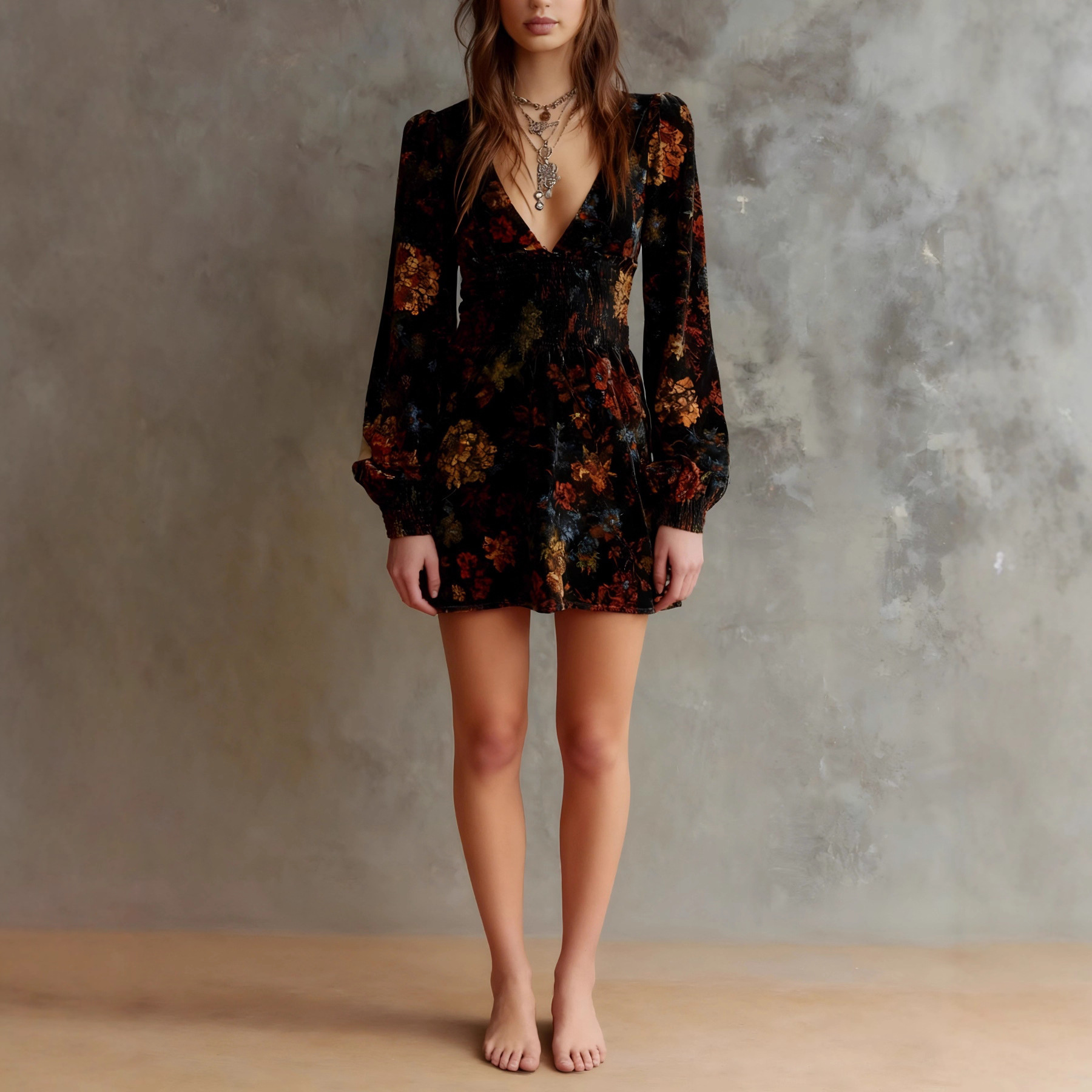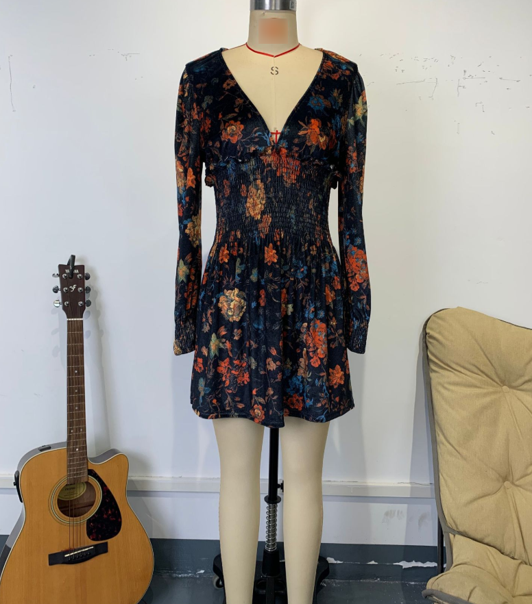 Elegant Floral Print V neck Velvet Dress Sexy Waist Trimming Long Sleeve Short Dress