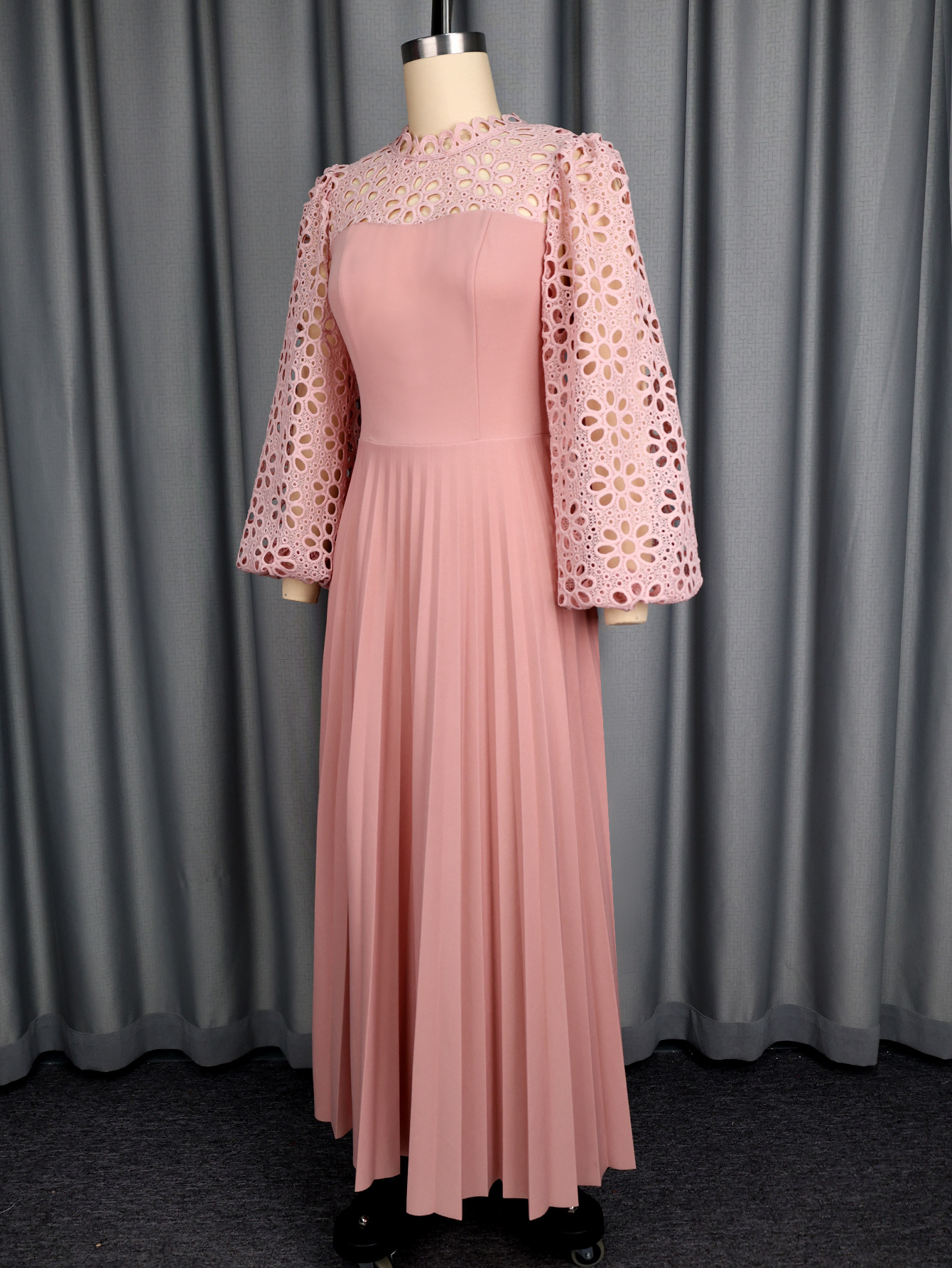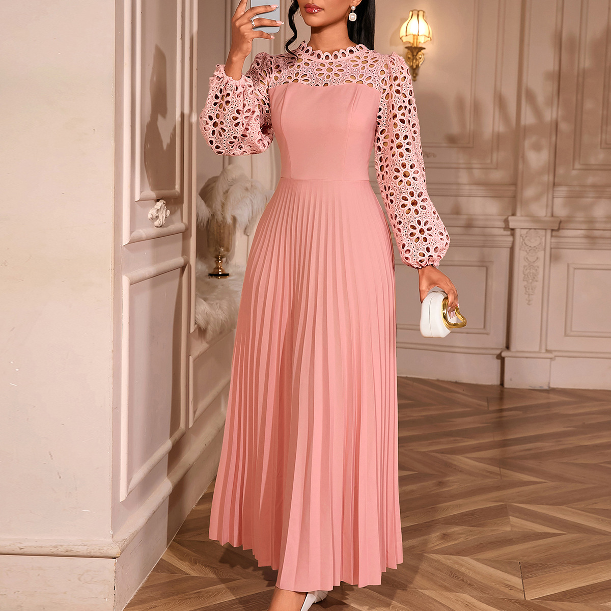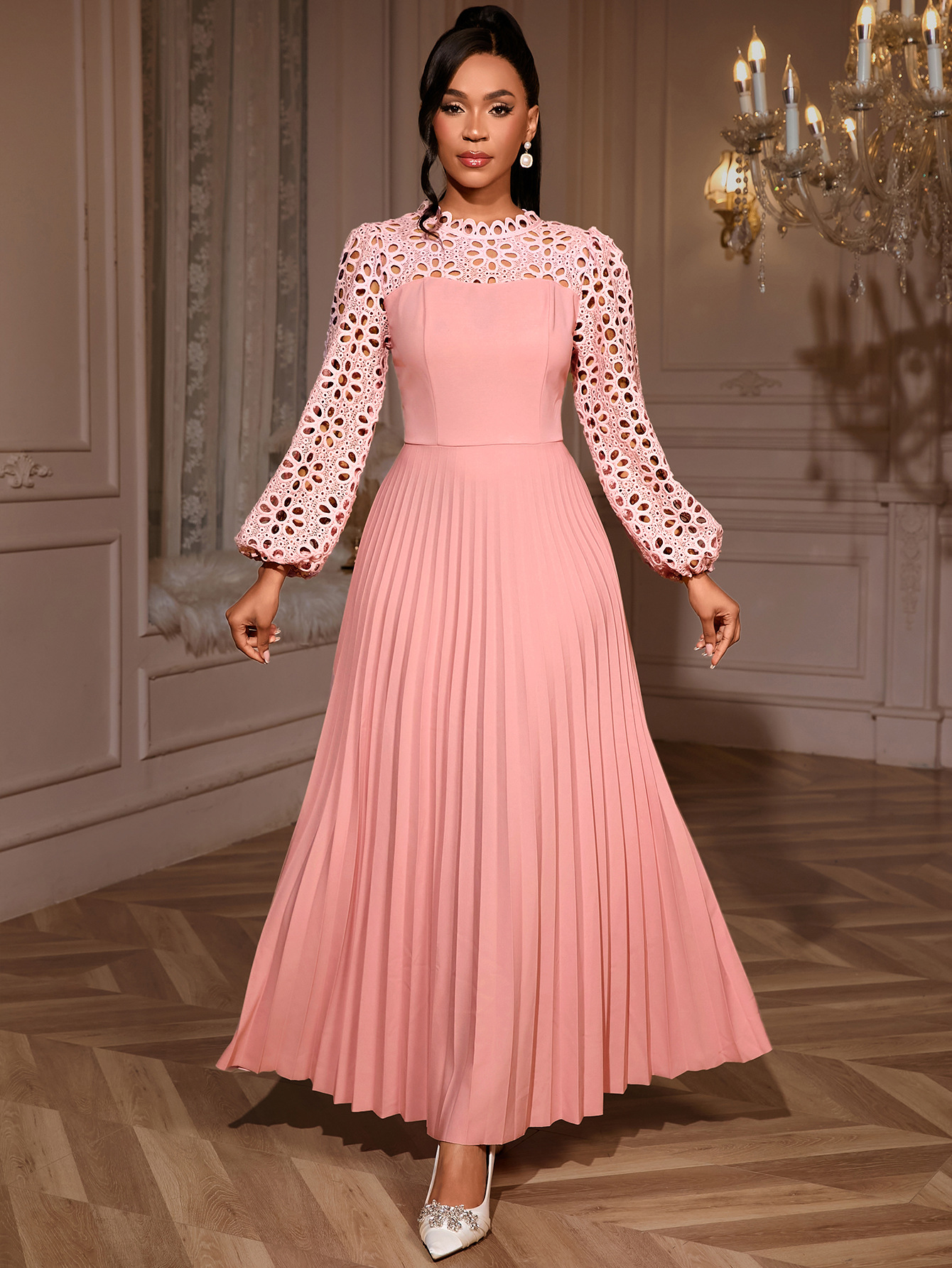 Elegant Lace Lantern Sleeve Dress Hollow Out Cutout out Long Sleeve Cinched Pleated Swing Party Dress