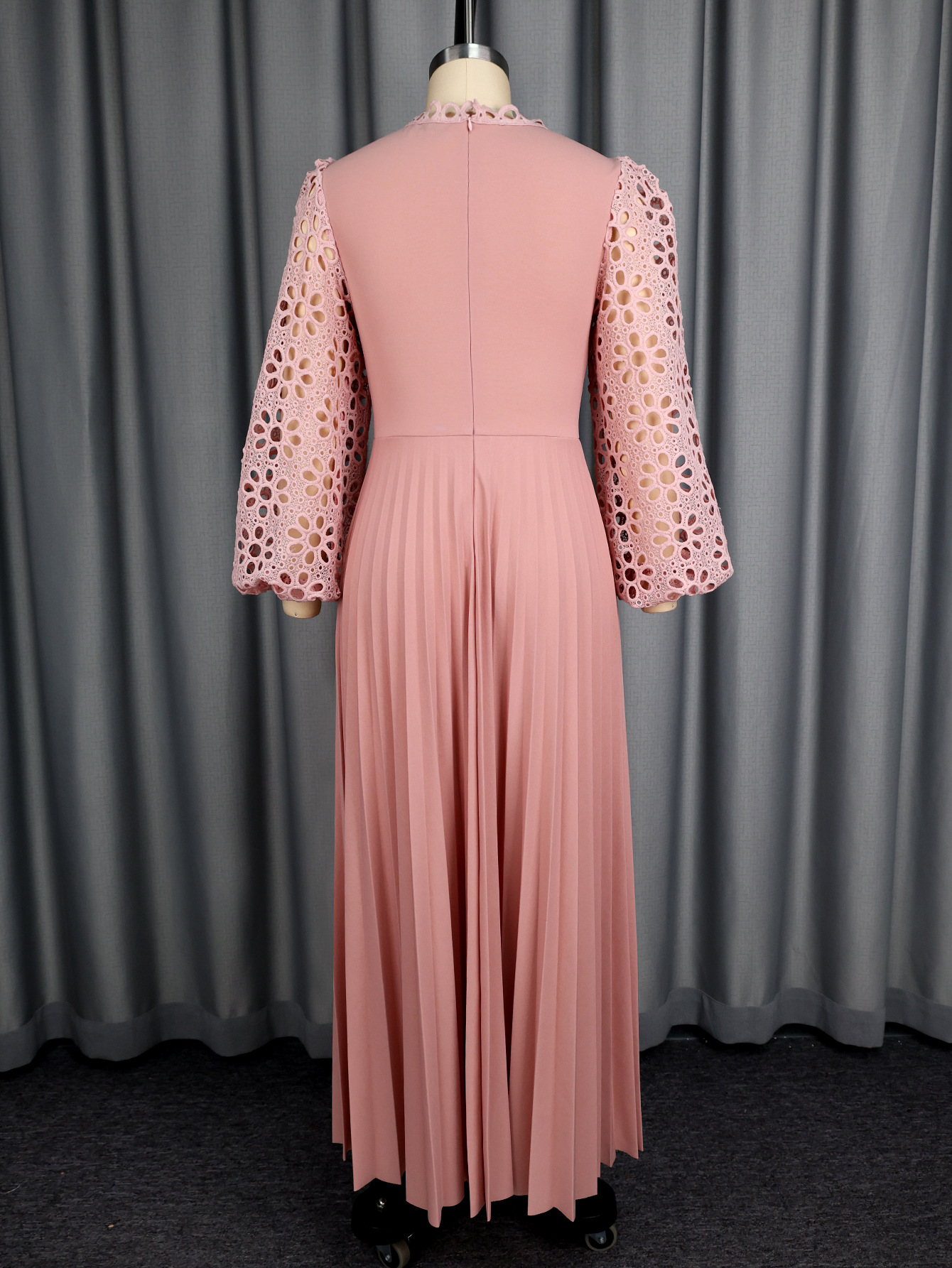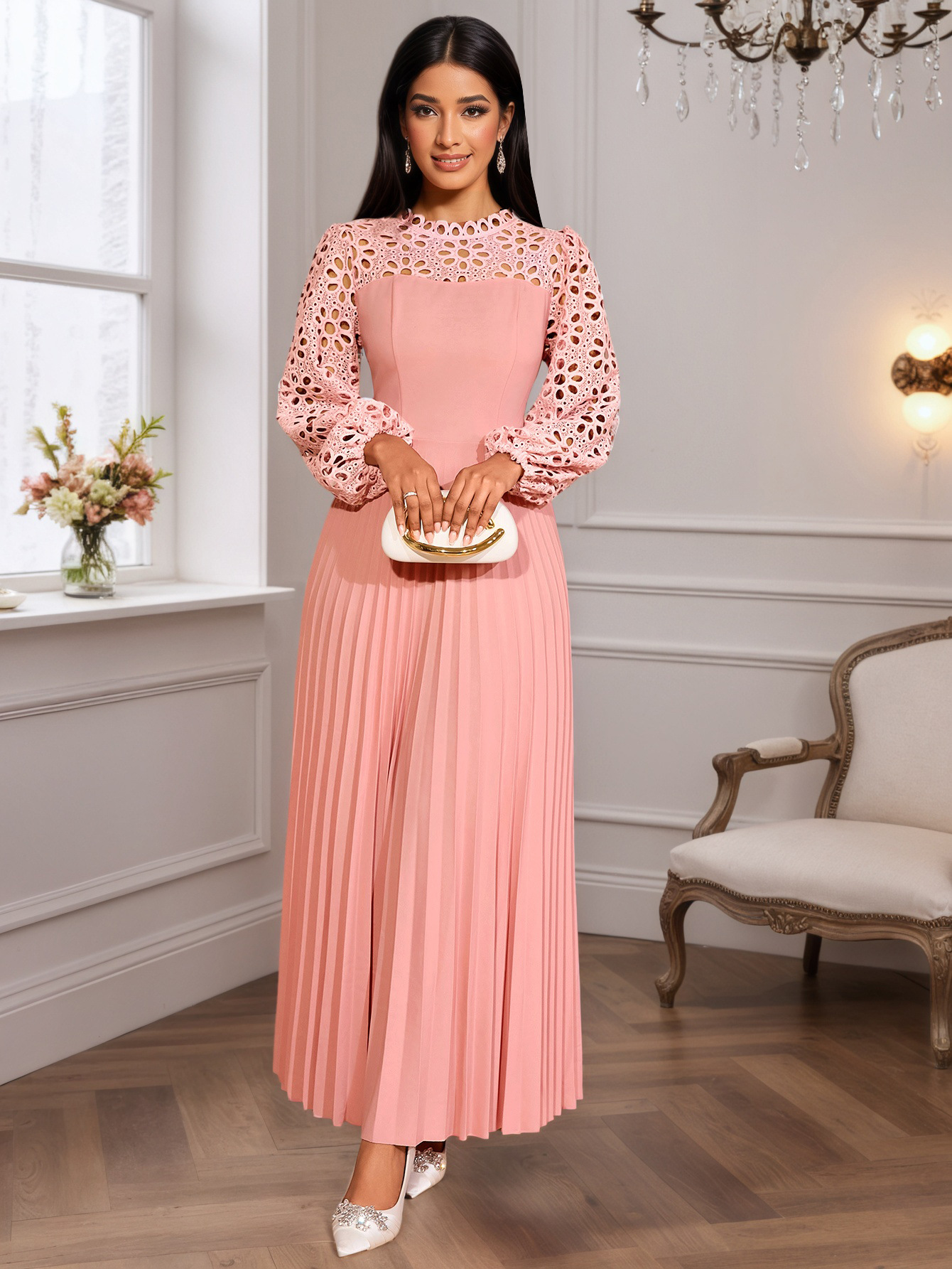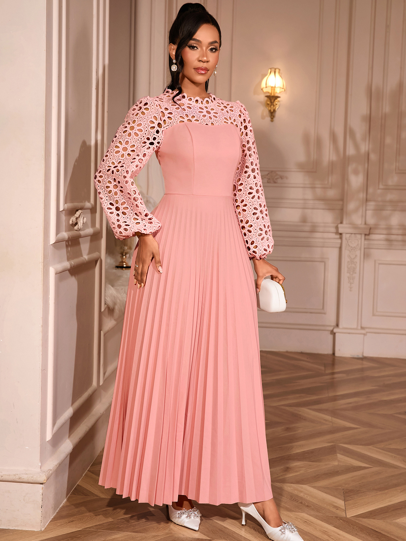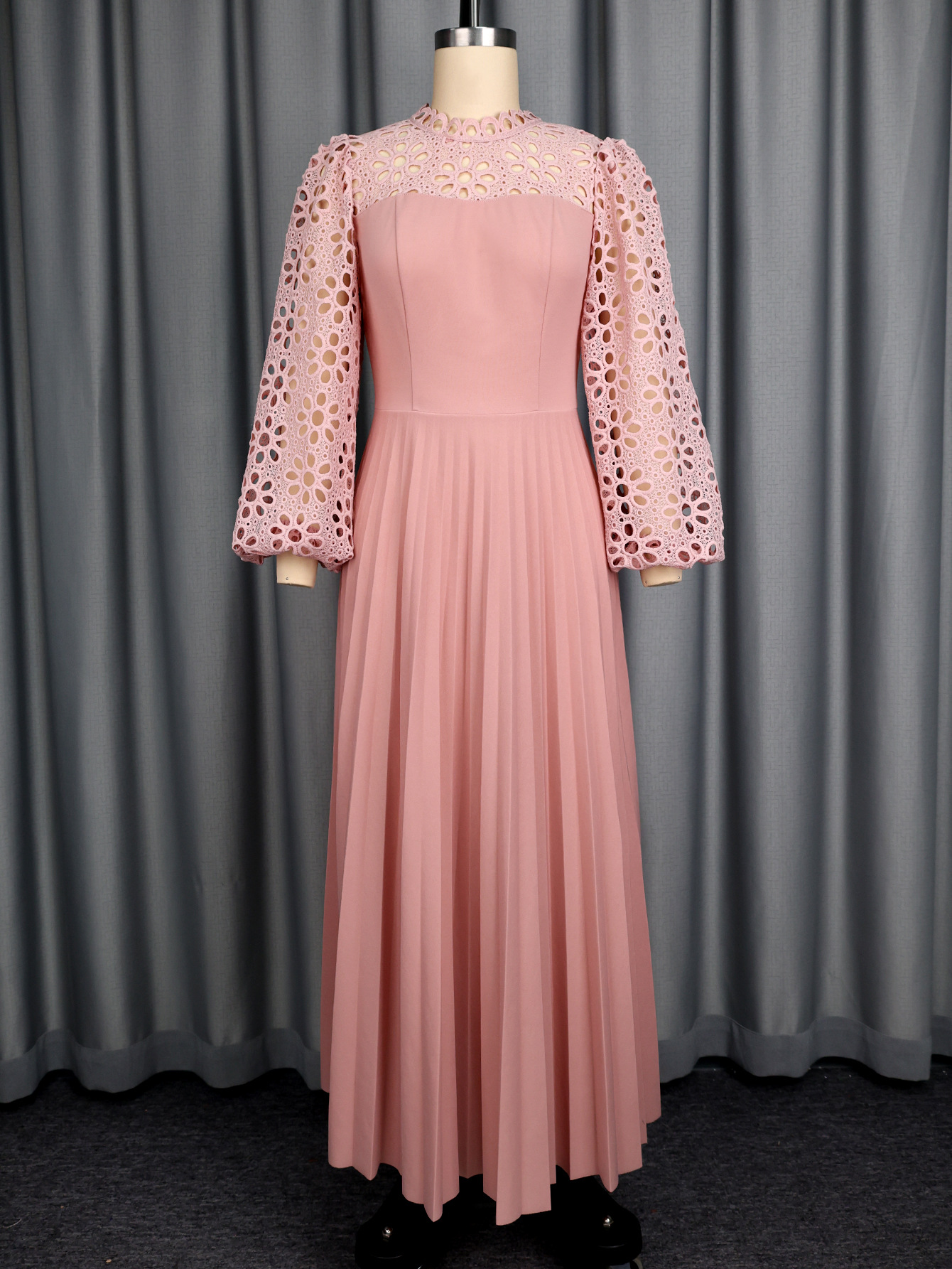 Elegant Lace Lantern Sleeve Dress Hollow Out Cutout out Long Sleeve Cinched Pleated Swing Party Dress