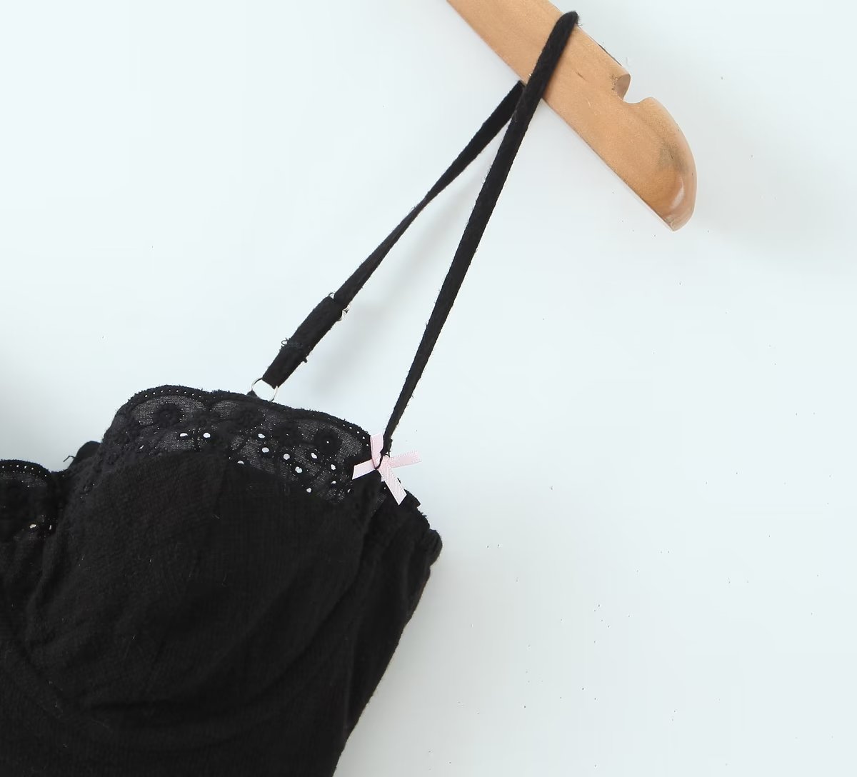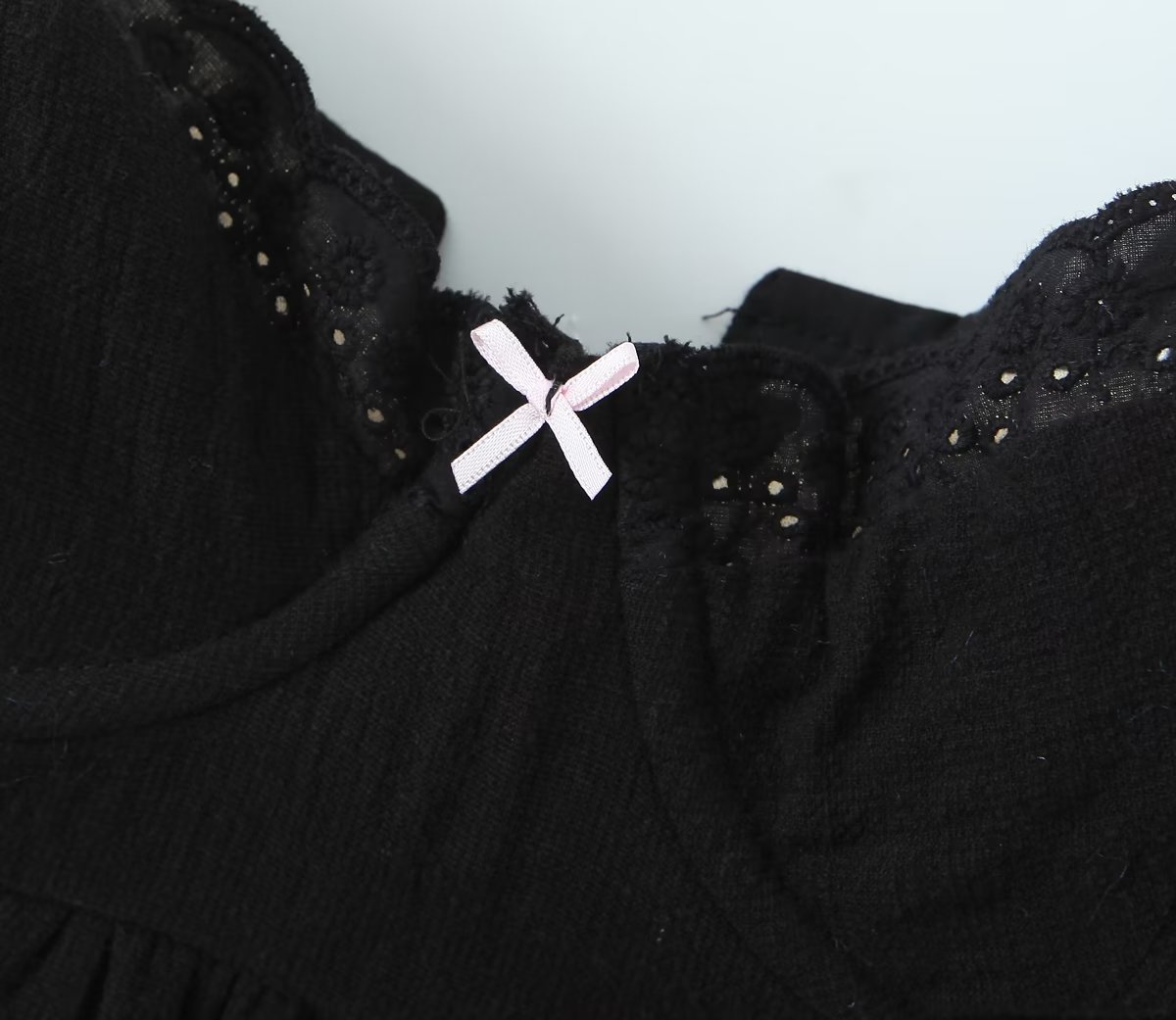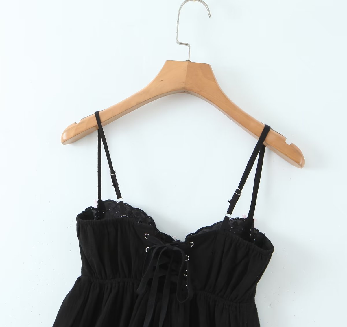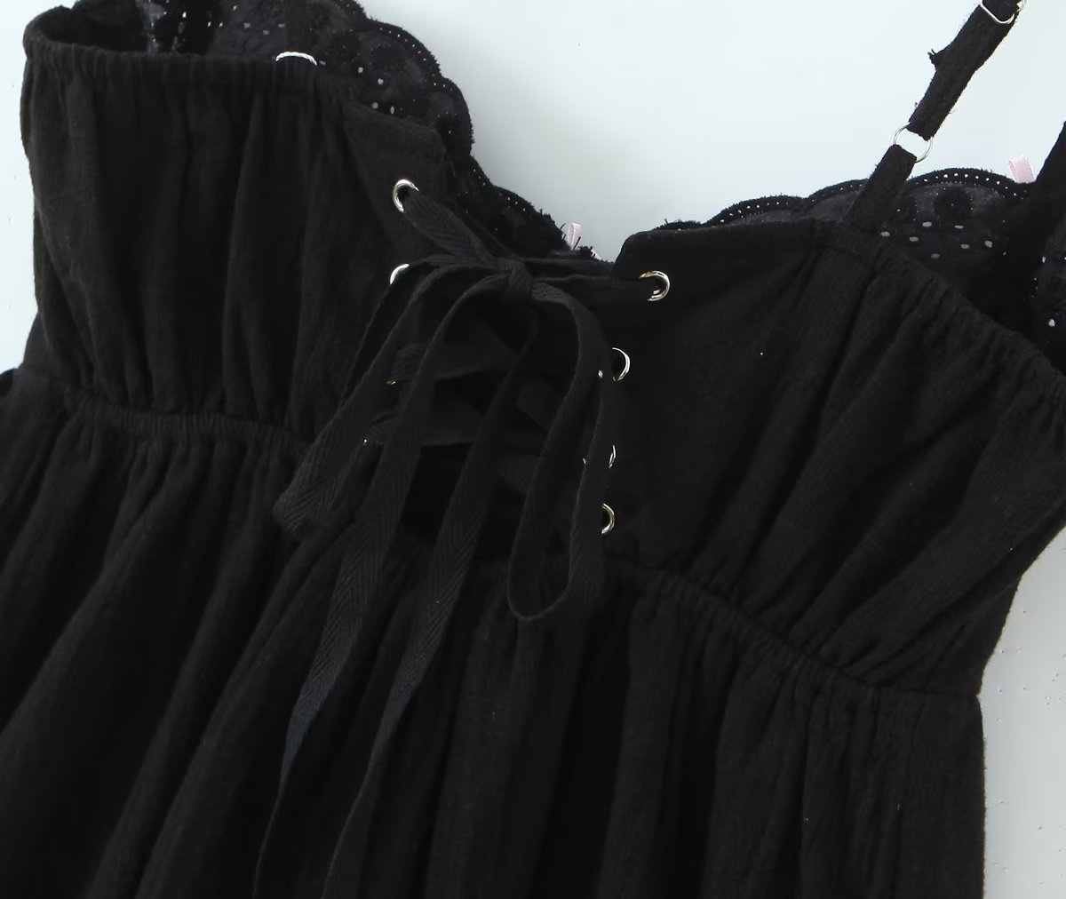 Fall Women Clothing Black Lace Panel Cotton Strap Mini Dress