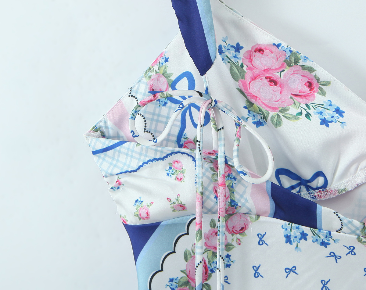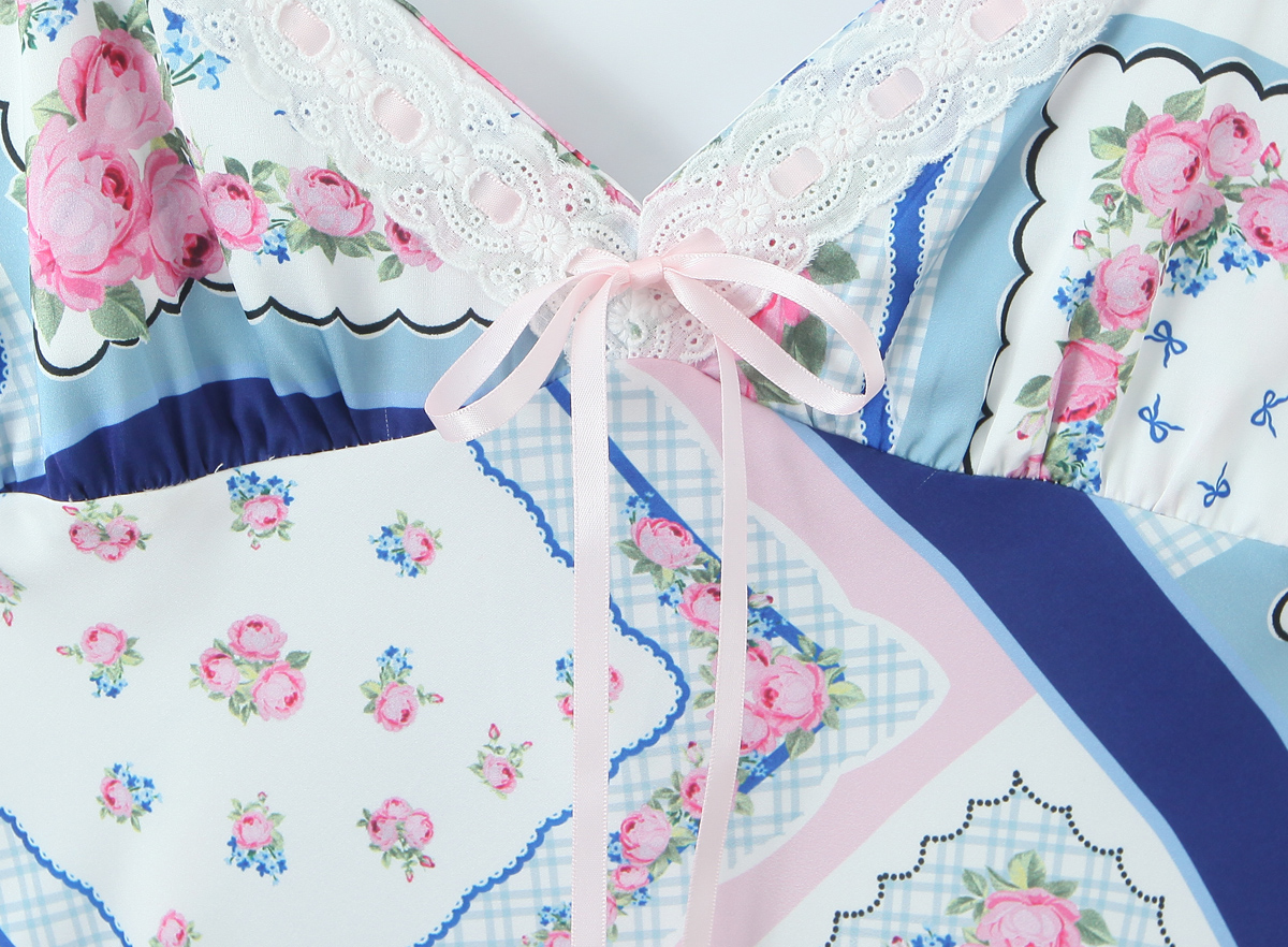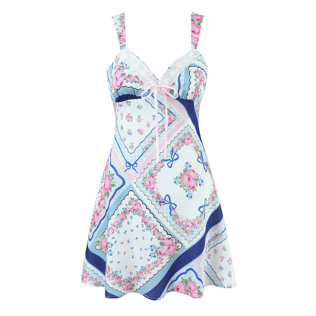 French Romantic Printed Satin Mini Strap Dress Women Bow A line Dress