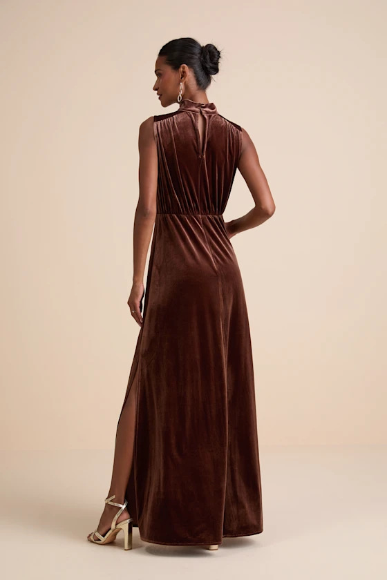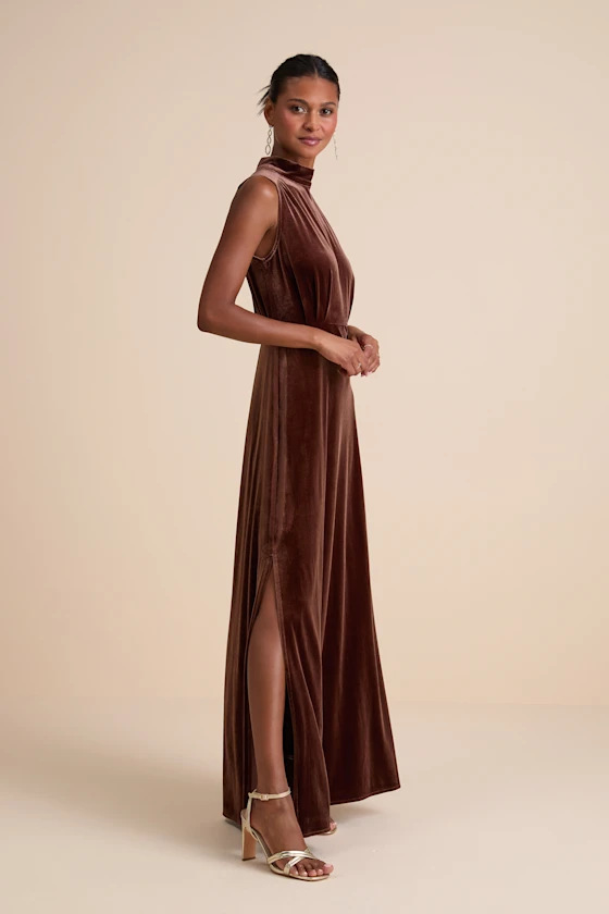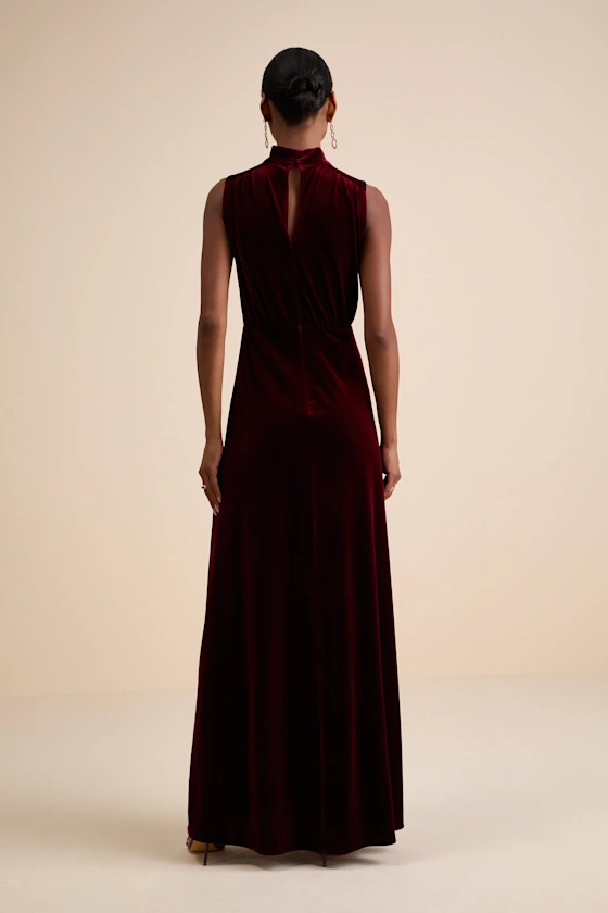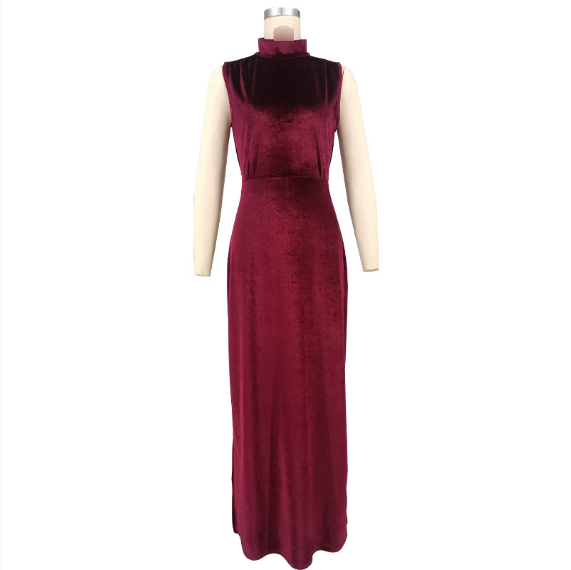 Graceful round Stand Collar Sleeveless Waist Slit Party Dinner Dress Solid Color Women Dress