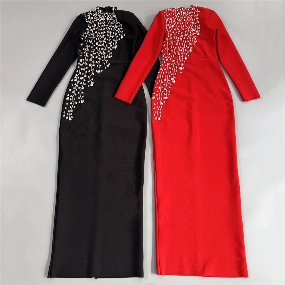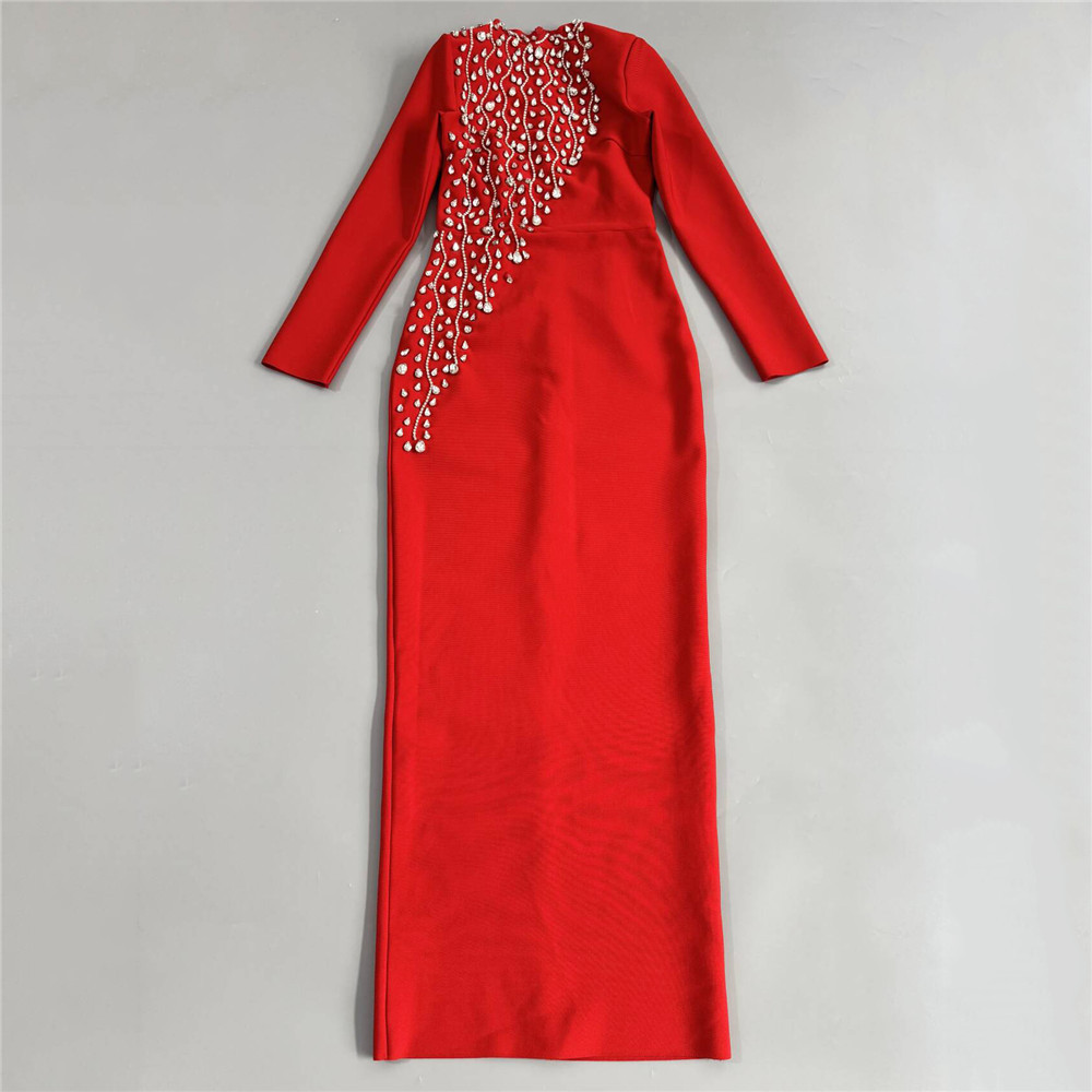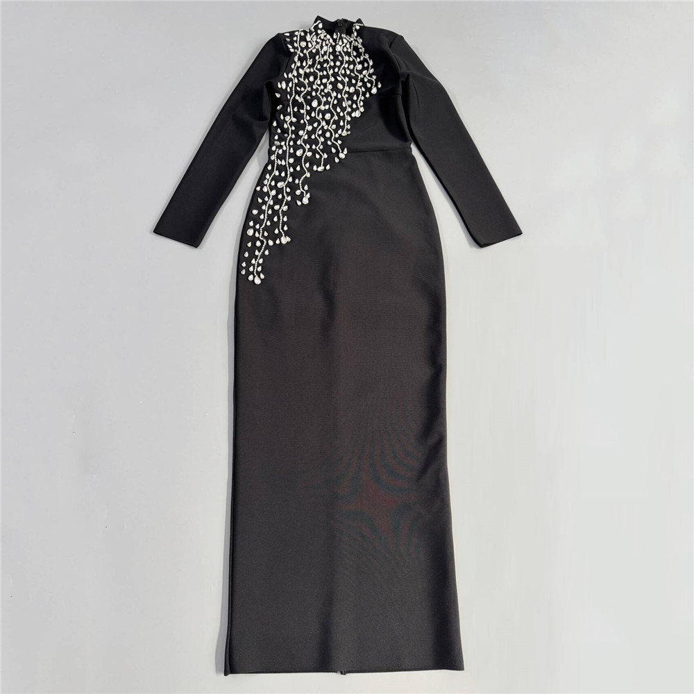 Heavy Industry Manual Rhinestone Long Sleeve Bandage One Piece Dress Socialite Elegant Dress the Dinner Party Maxi Dress