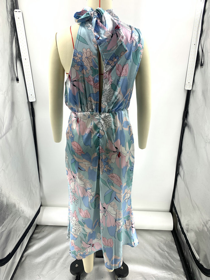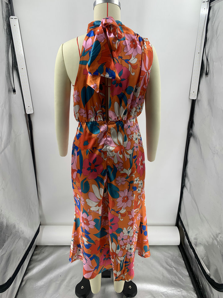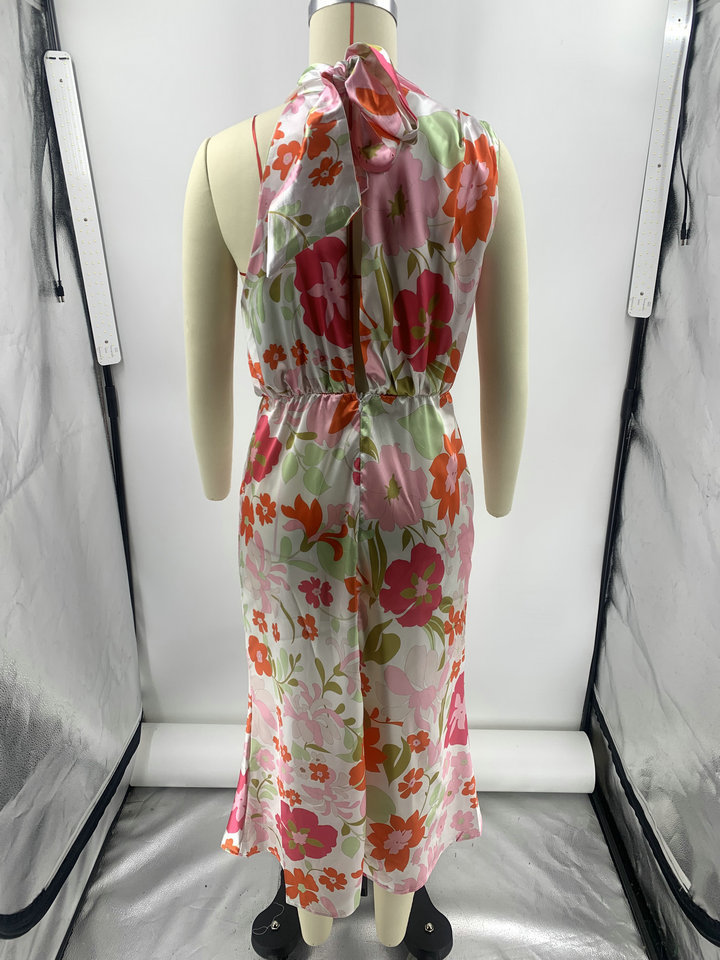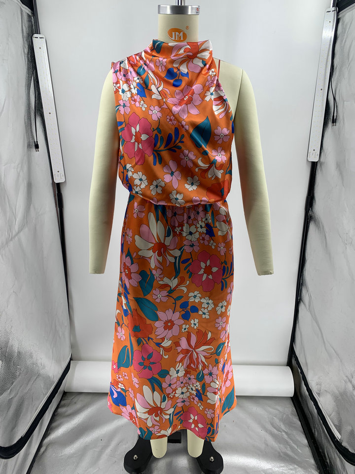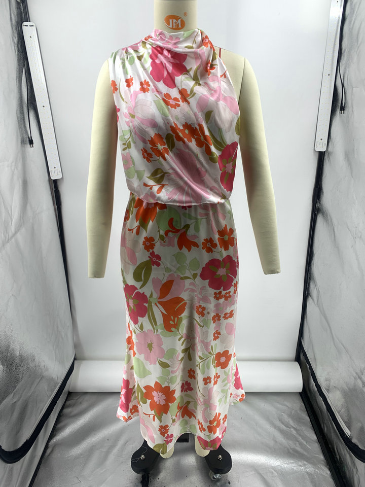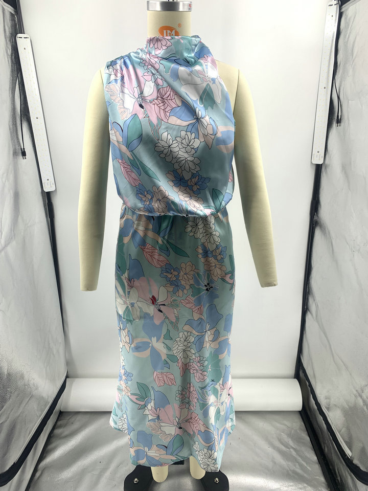 Mature Elegant Women Sleeveless Strap Printing Satin Dress