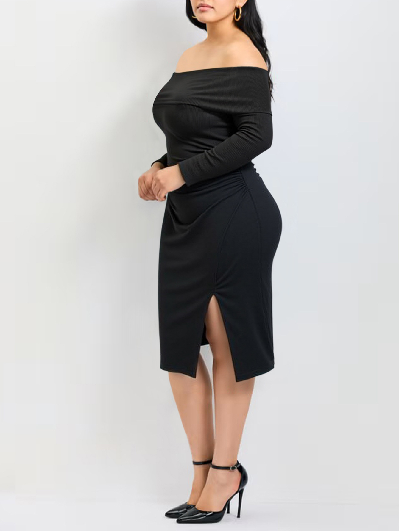 Plus Size Women Clothes Autumn French Sexy Strapless Long Sleeve Slim Fit Slimming Knitted Sheath Split Dress