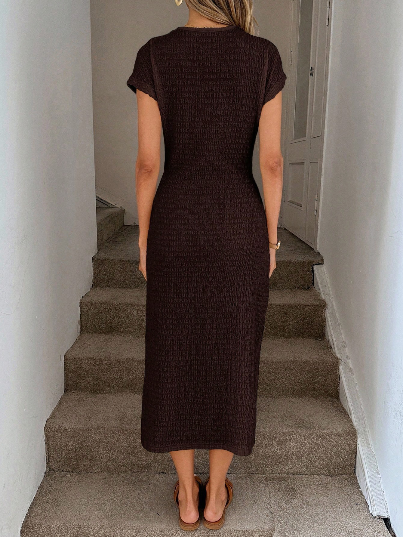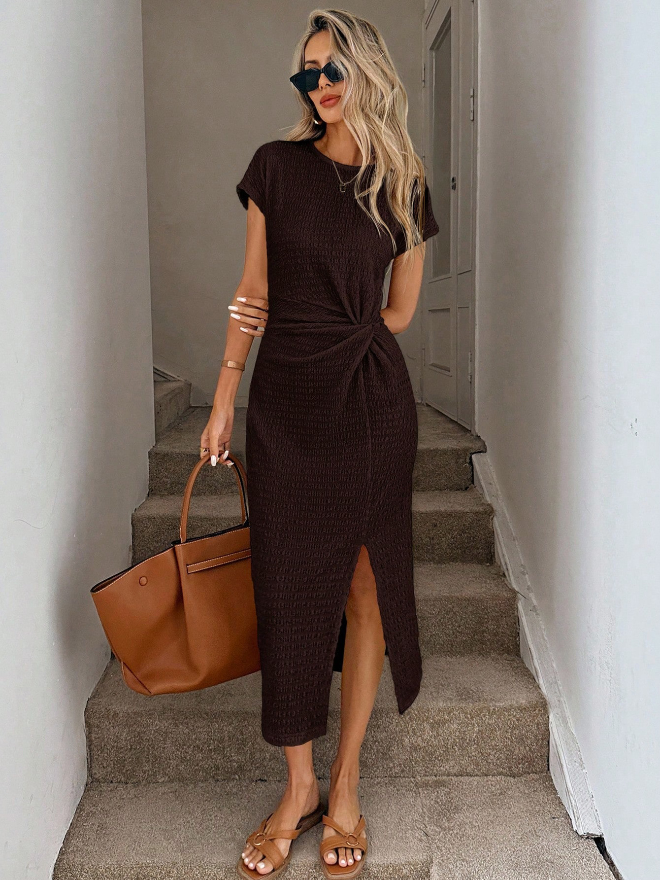 Retro Modern Brown Short Sleeves Waist Split Mid Length Elegant Women Dress