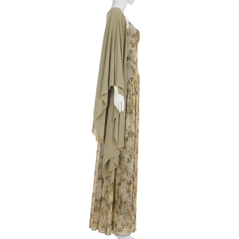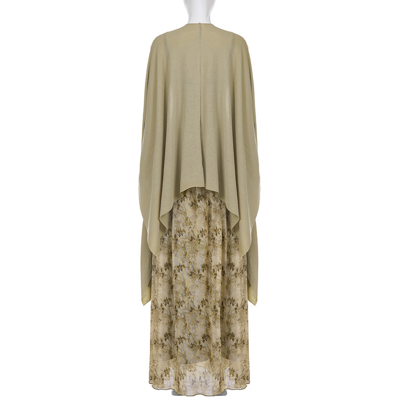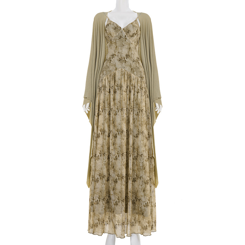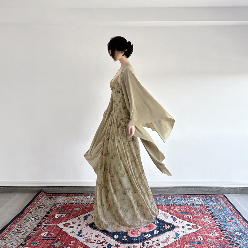 Retro Mori Green Dress Slimming Batwing Sleeves Sun Protection Cardigan Cinched Slimming Maxi Dress Two Piece Sets