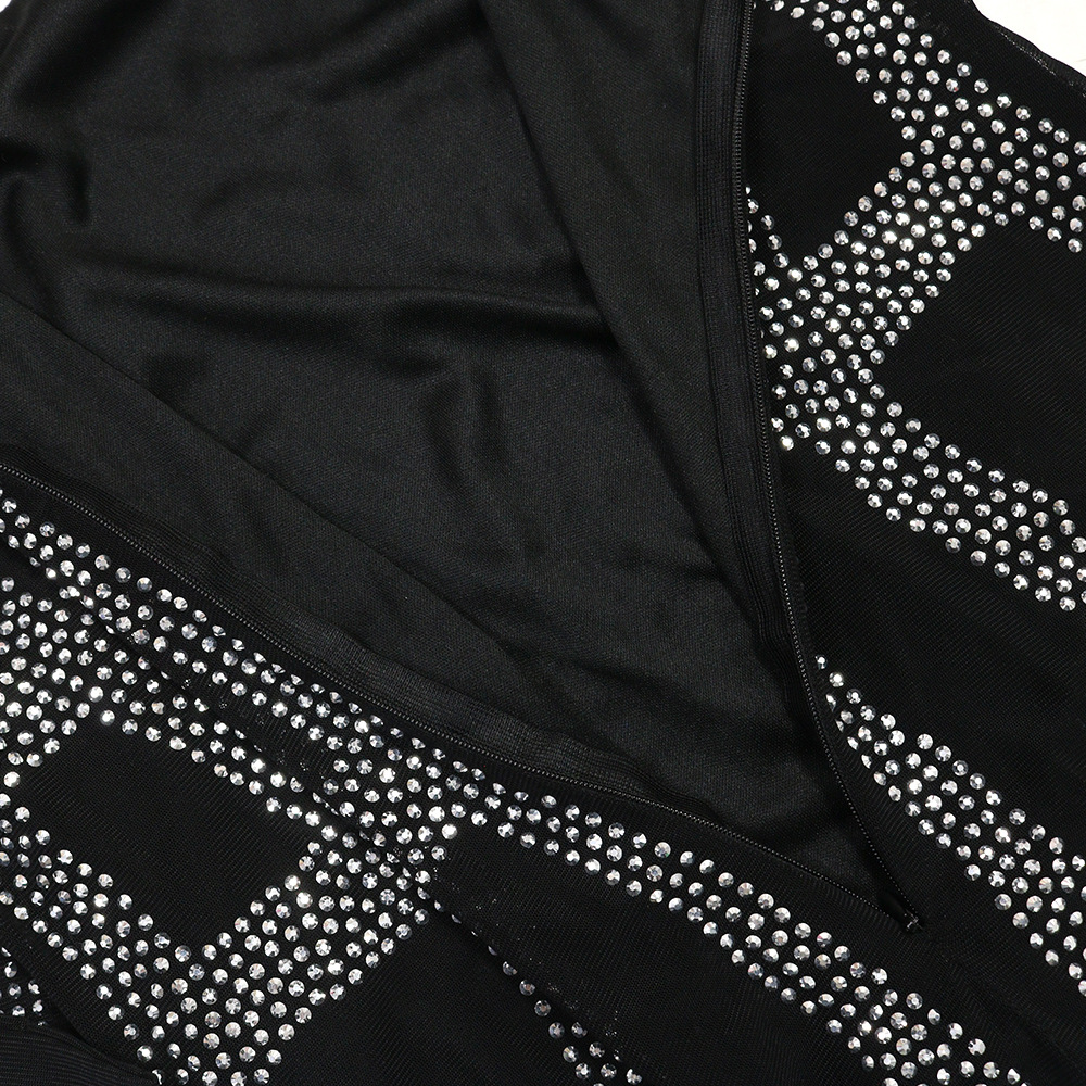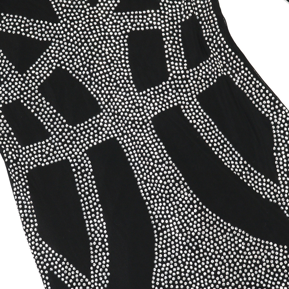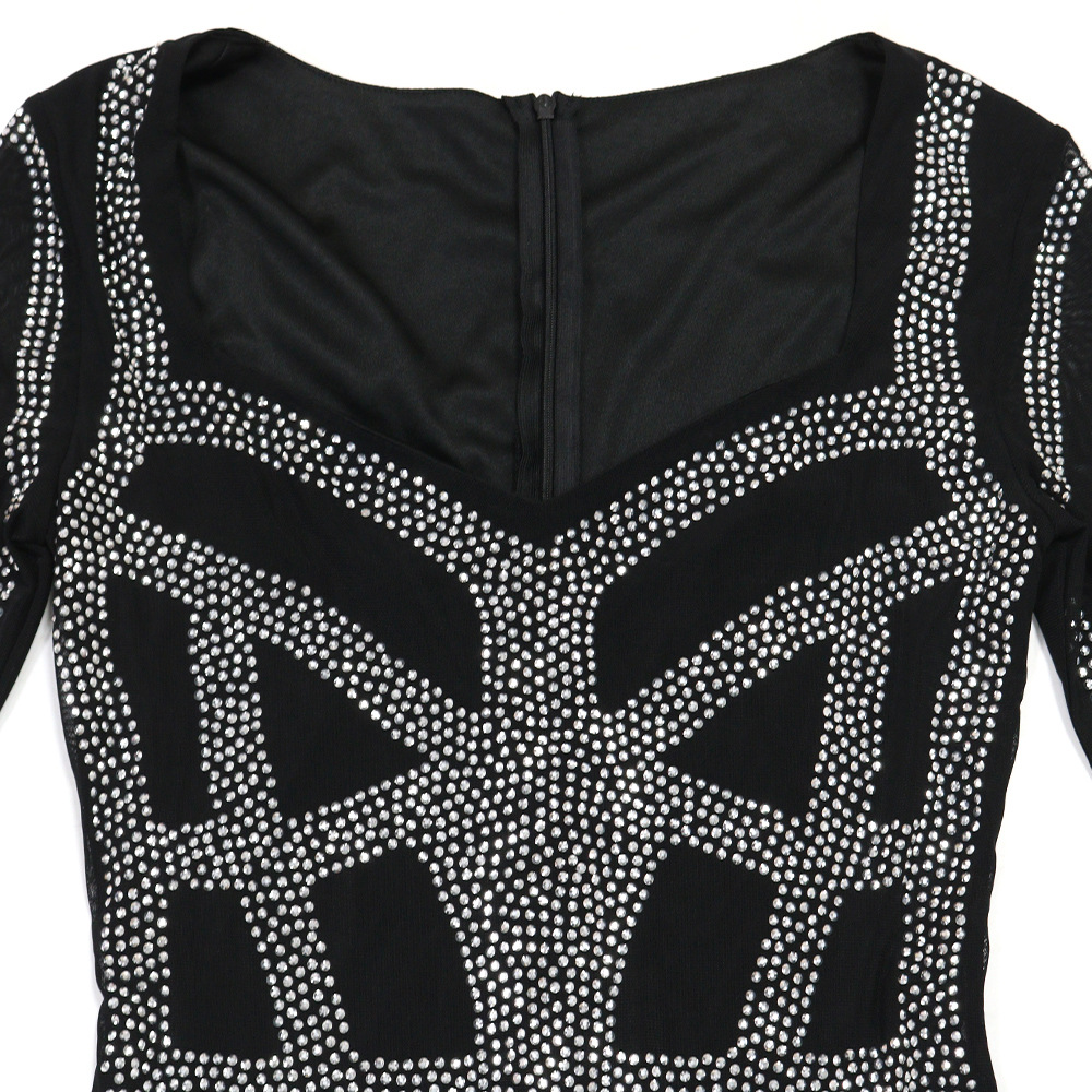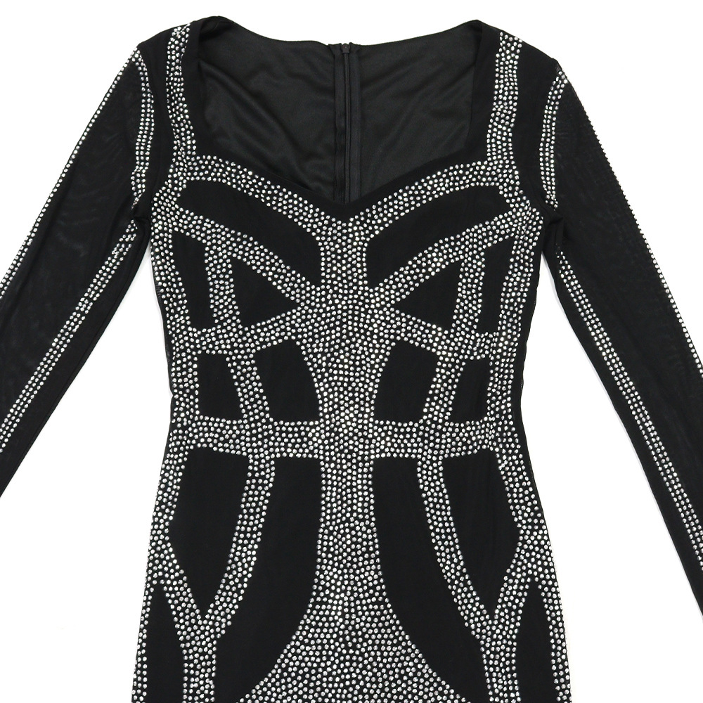 Sexy Rhinestone Square Cut Collar Sheath Stretch Long Slim Fit Long Sleeved Women Dress