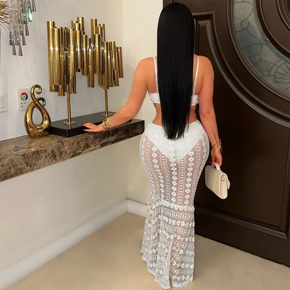Sexy V neck Brace Lace See through Sheath Dress Cropped Outfit Maxi Dress