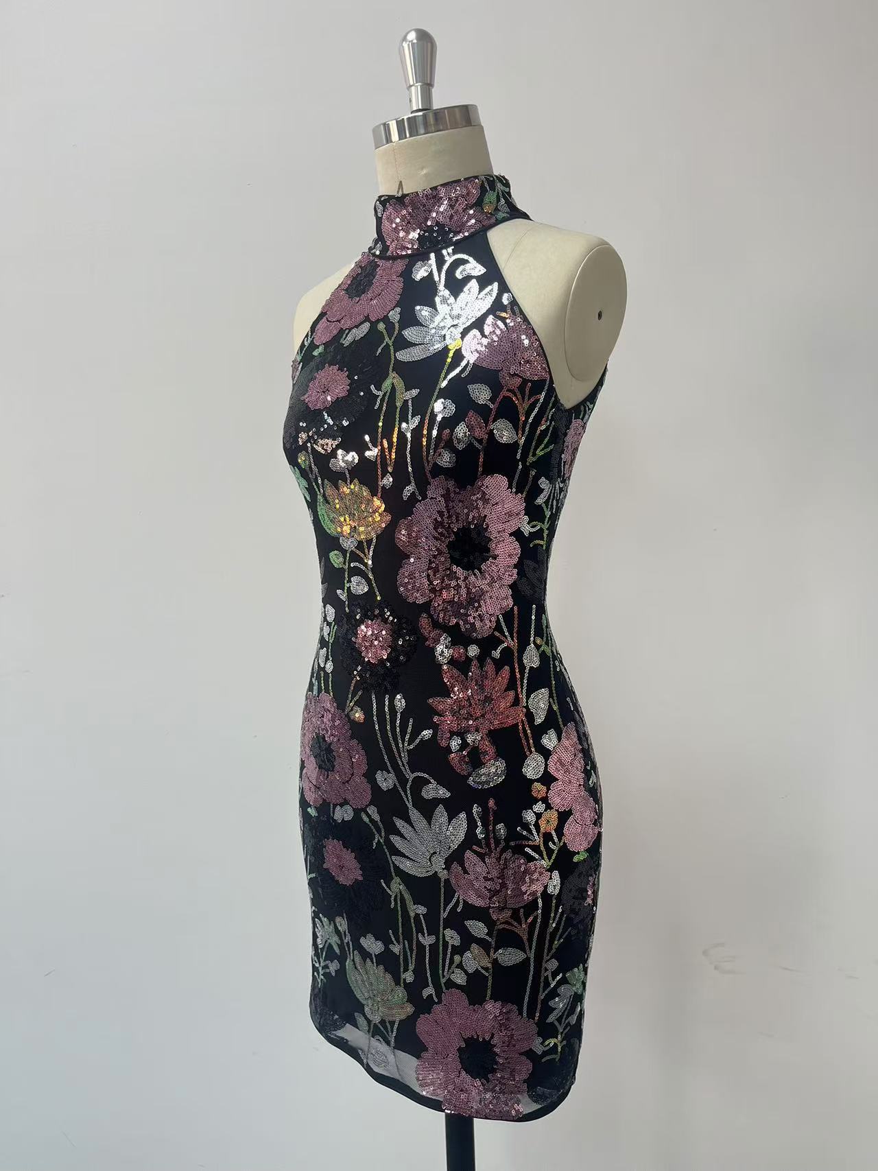 Spring Summer Design Sexy Backless Mini Party Dress Shiny Embroidery Three Dimensional Floral Short Dress
