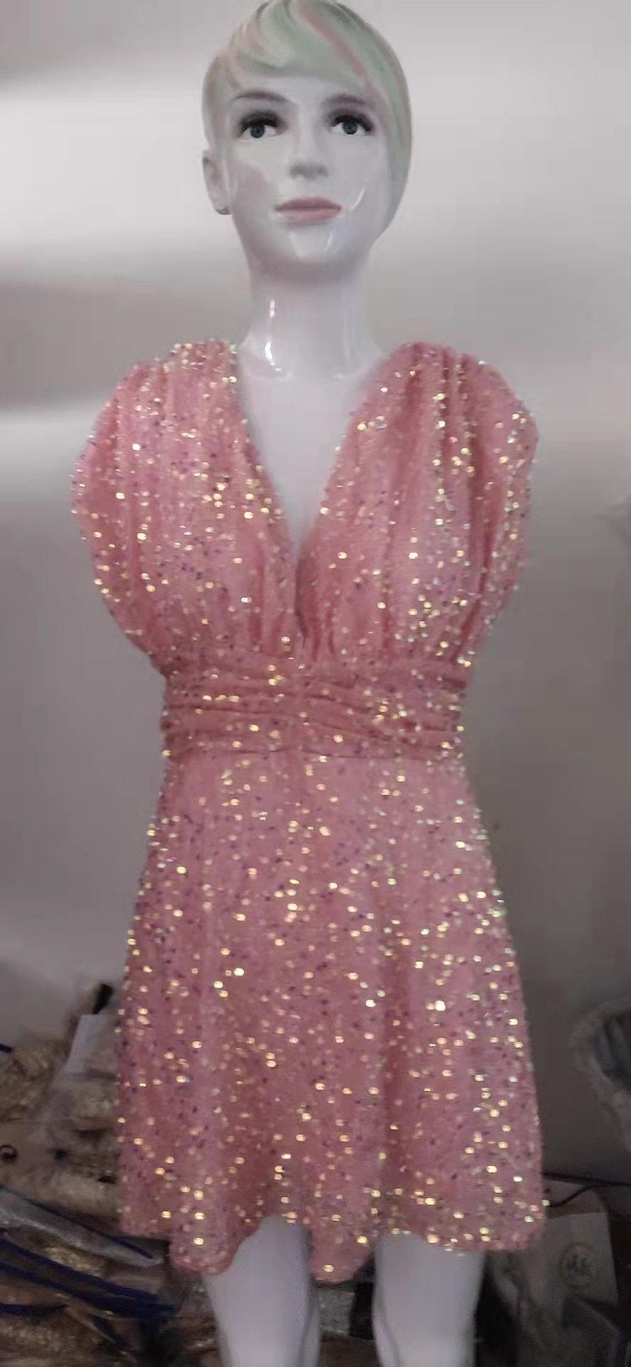 Summer Women Clothing Dress V-neck Sequ Waist-Controlled Lace-up Backless