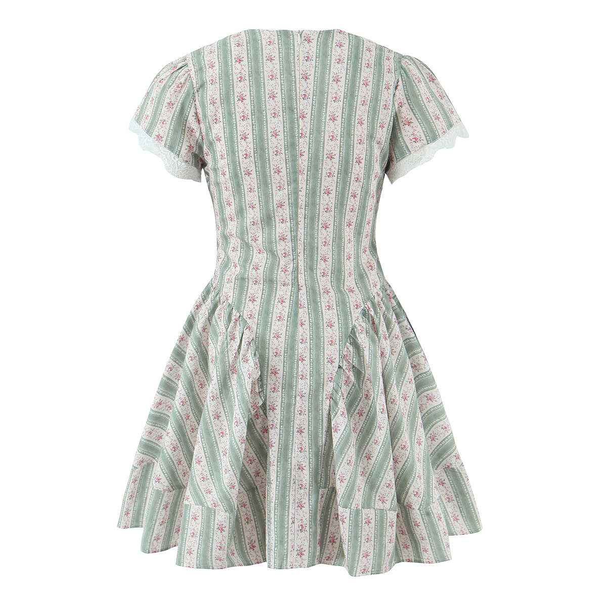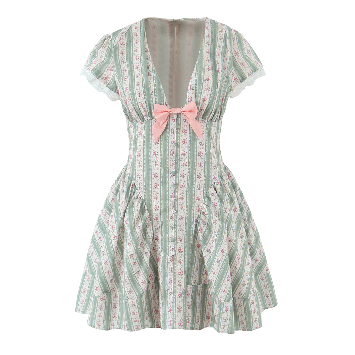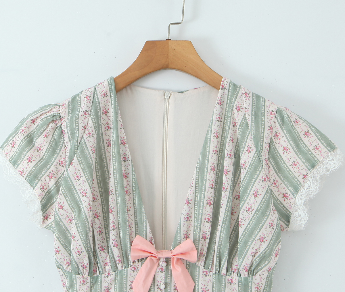 Sweet Romantic Floral Bowknot Decoration Striped Lace V neck Mini Dress Short Dress Women