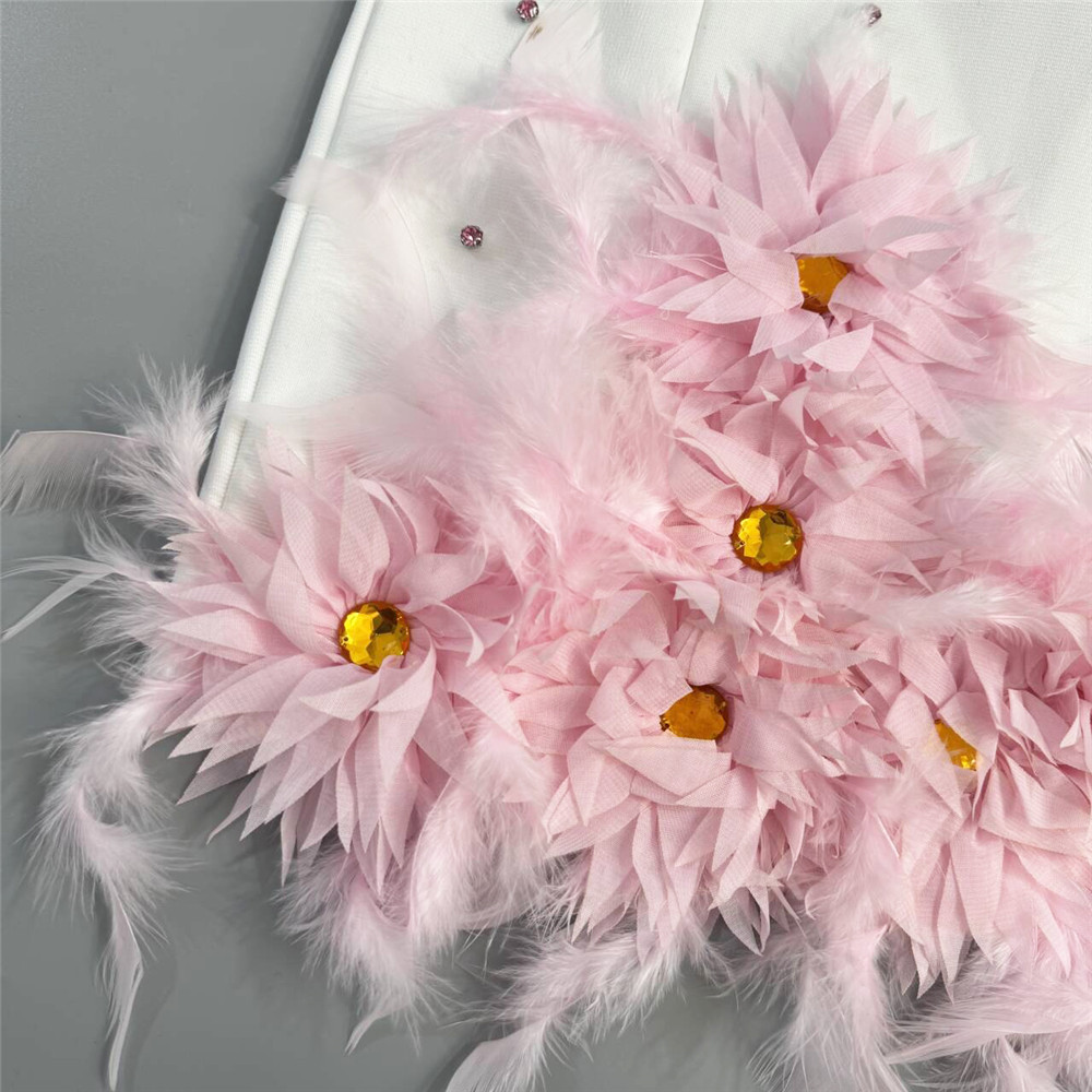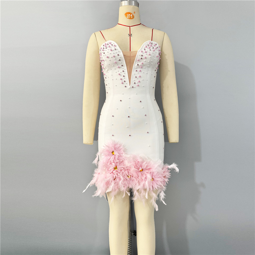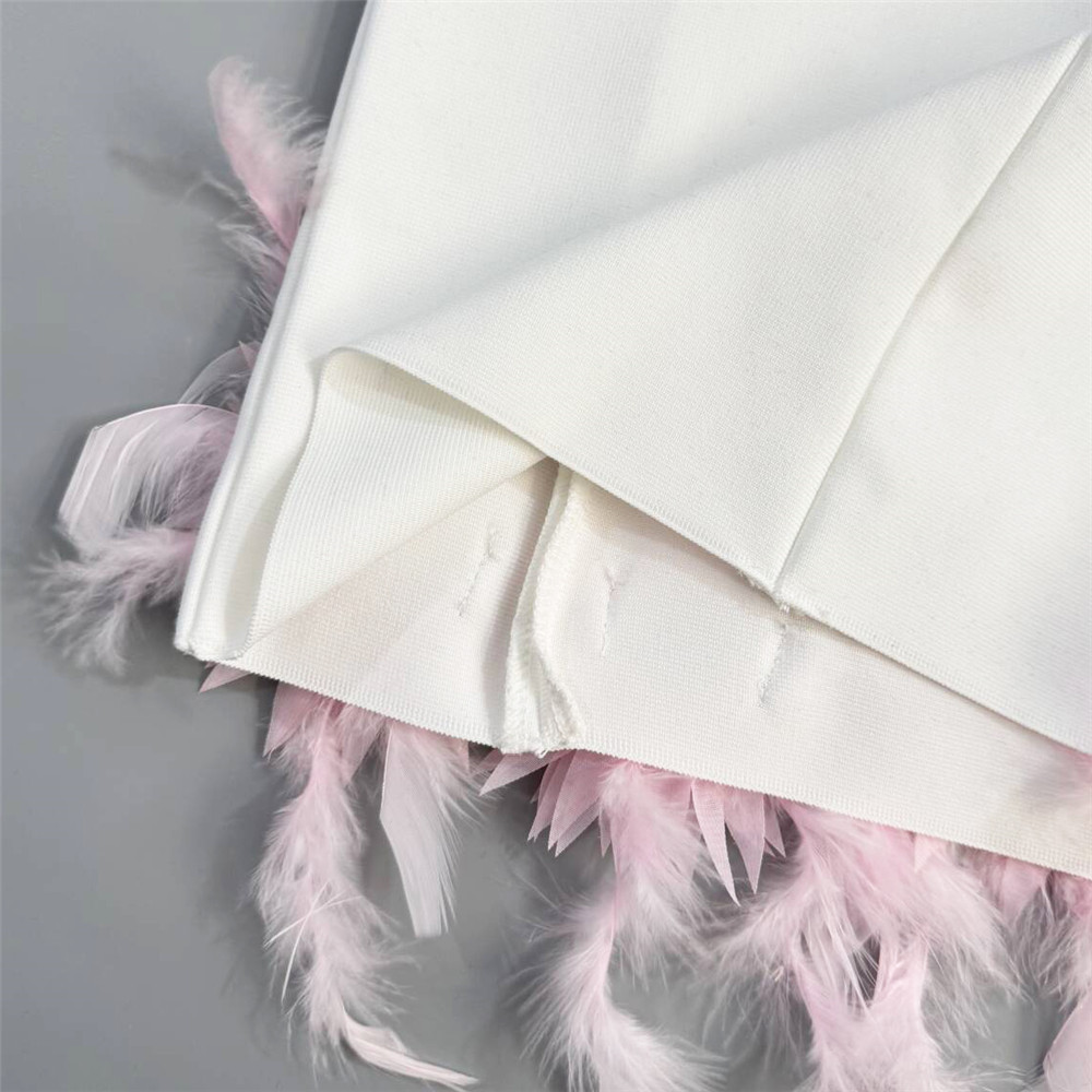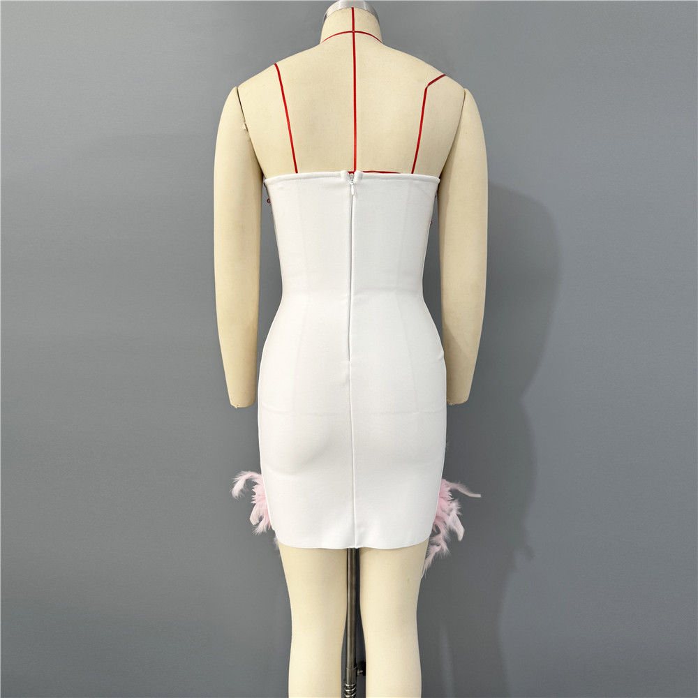 Tube Top Beads Rhinestones Bandage One Piece Dress Pink Feather Ladies Party Cocktail Evening Dress