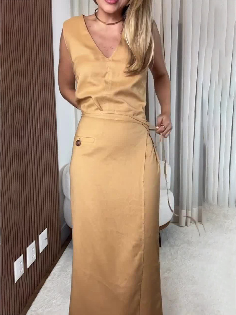 V Neck Sleeveless Irregular Asymmetric Lace Up Slim Dress Faux Two Piece Split Women Clothing