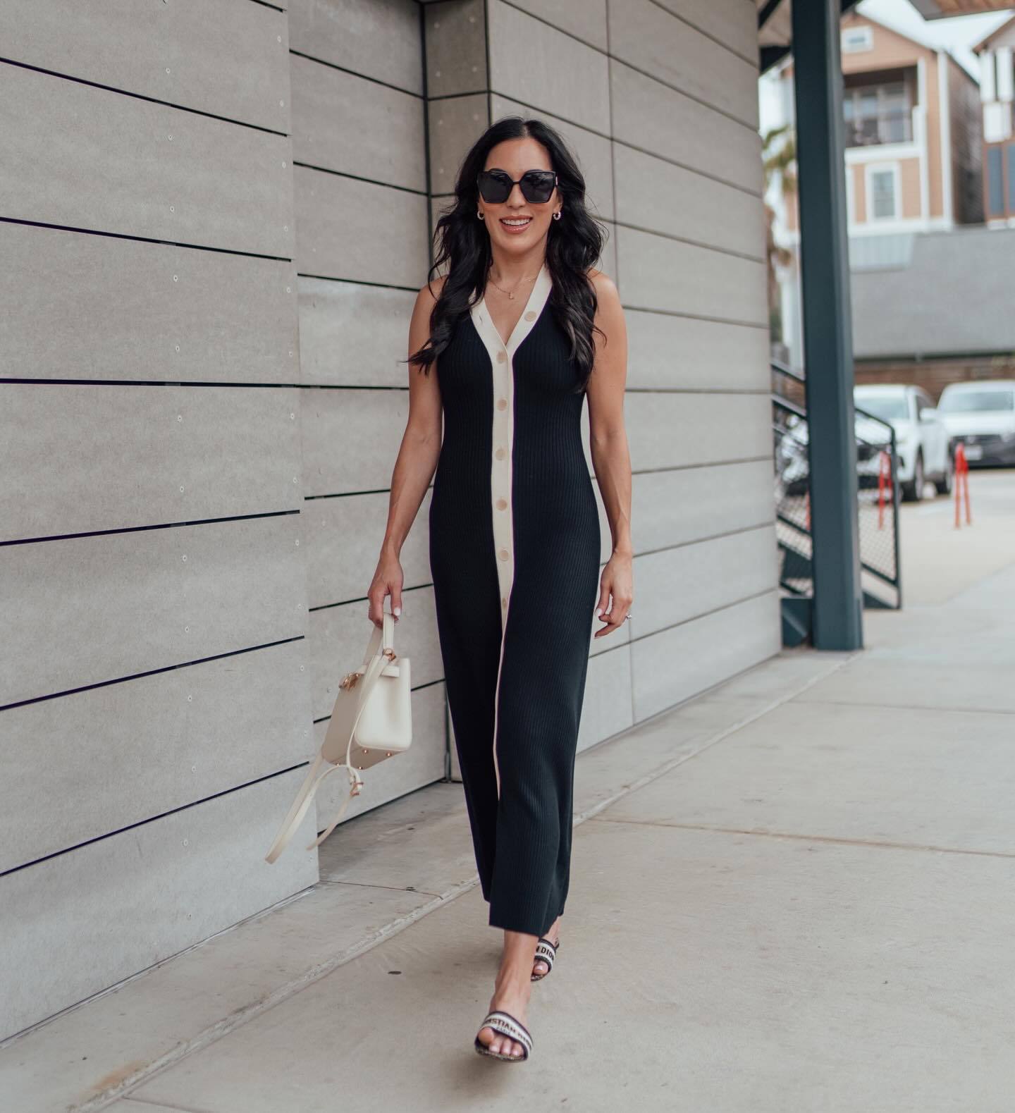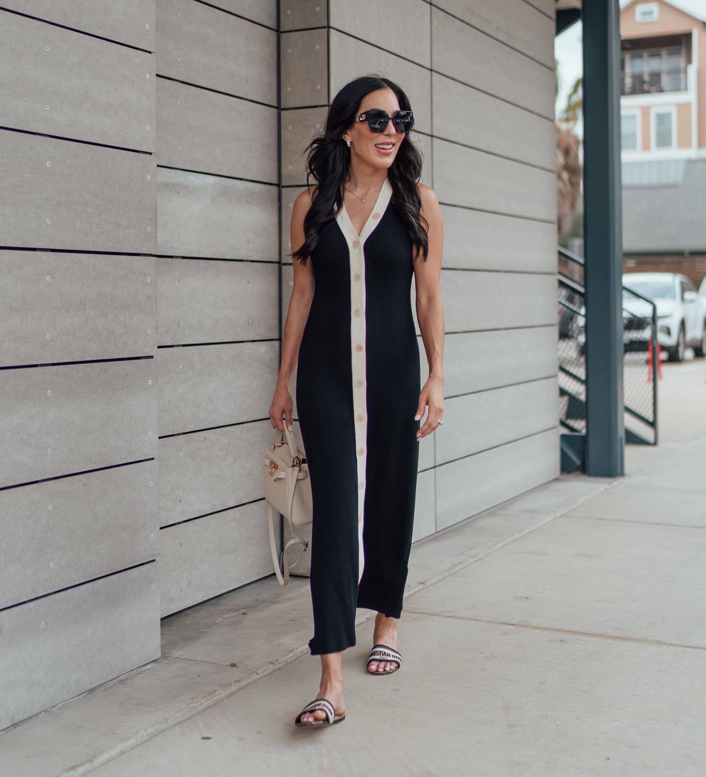 V neck Sleeveless Single Breasted Knitted Dress Tight Midi Dress Contrast Color Cardigan Sexy Summer Dress