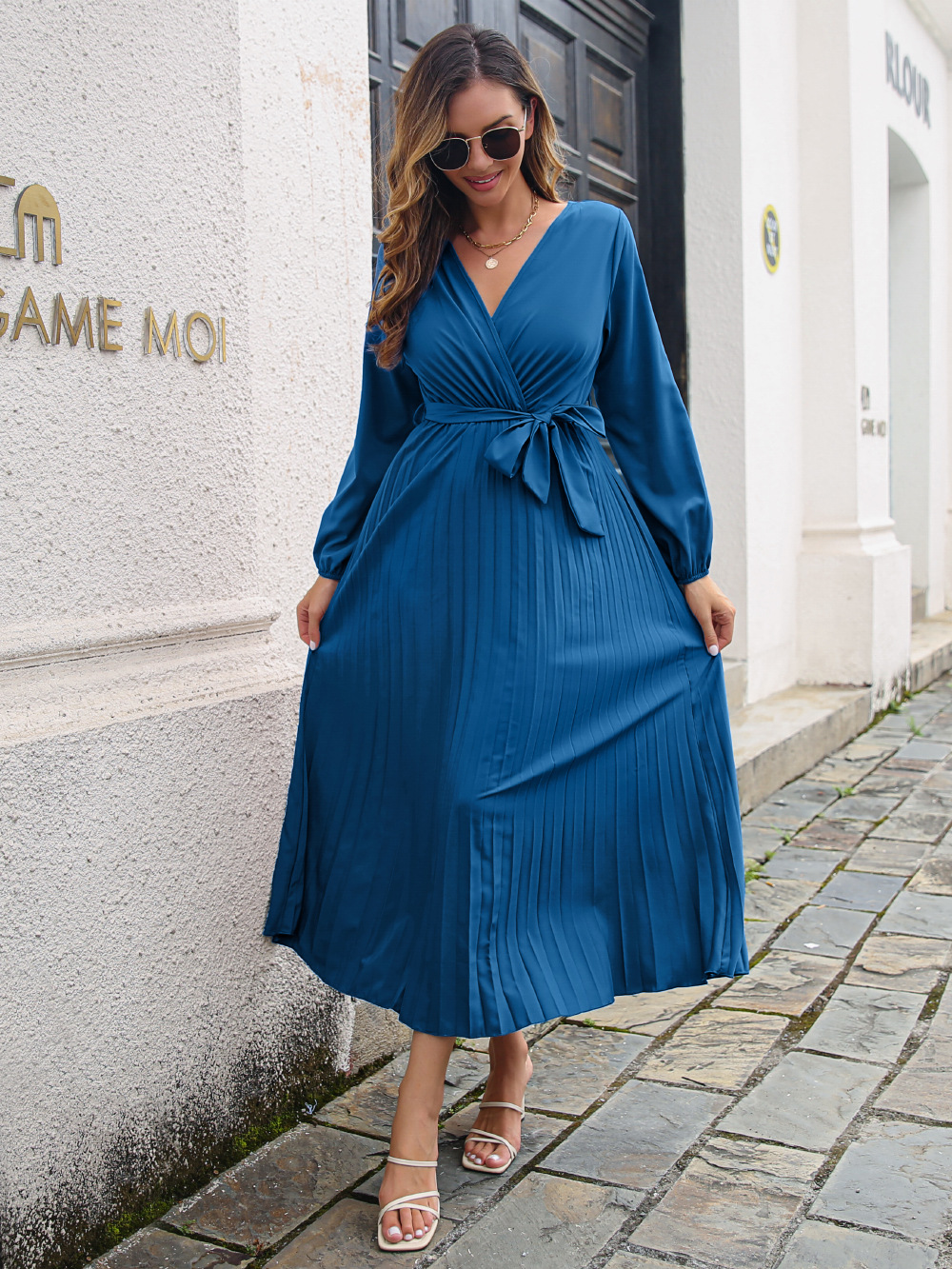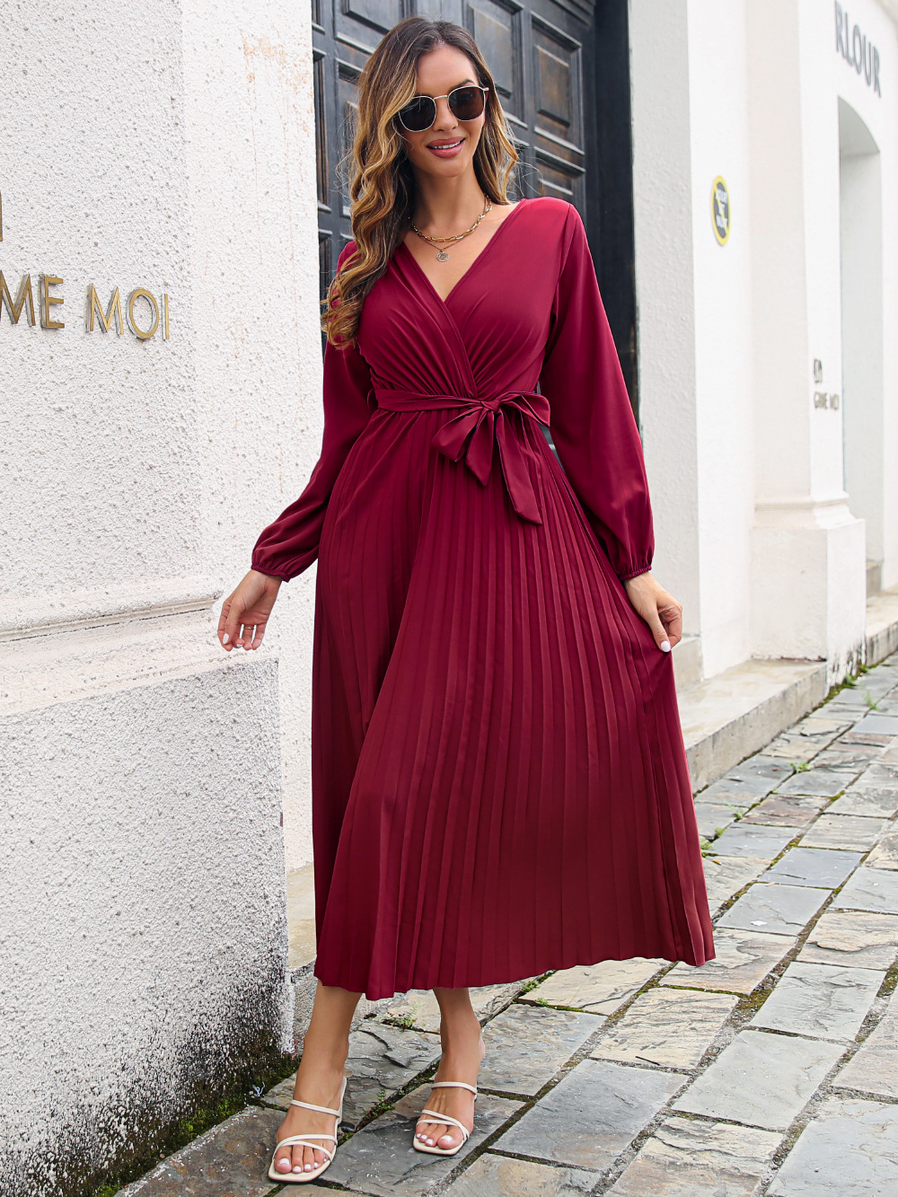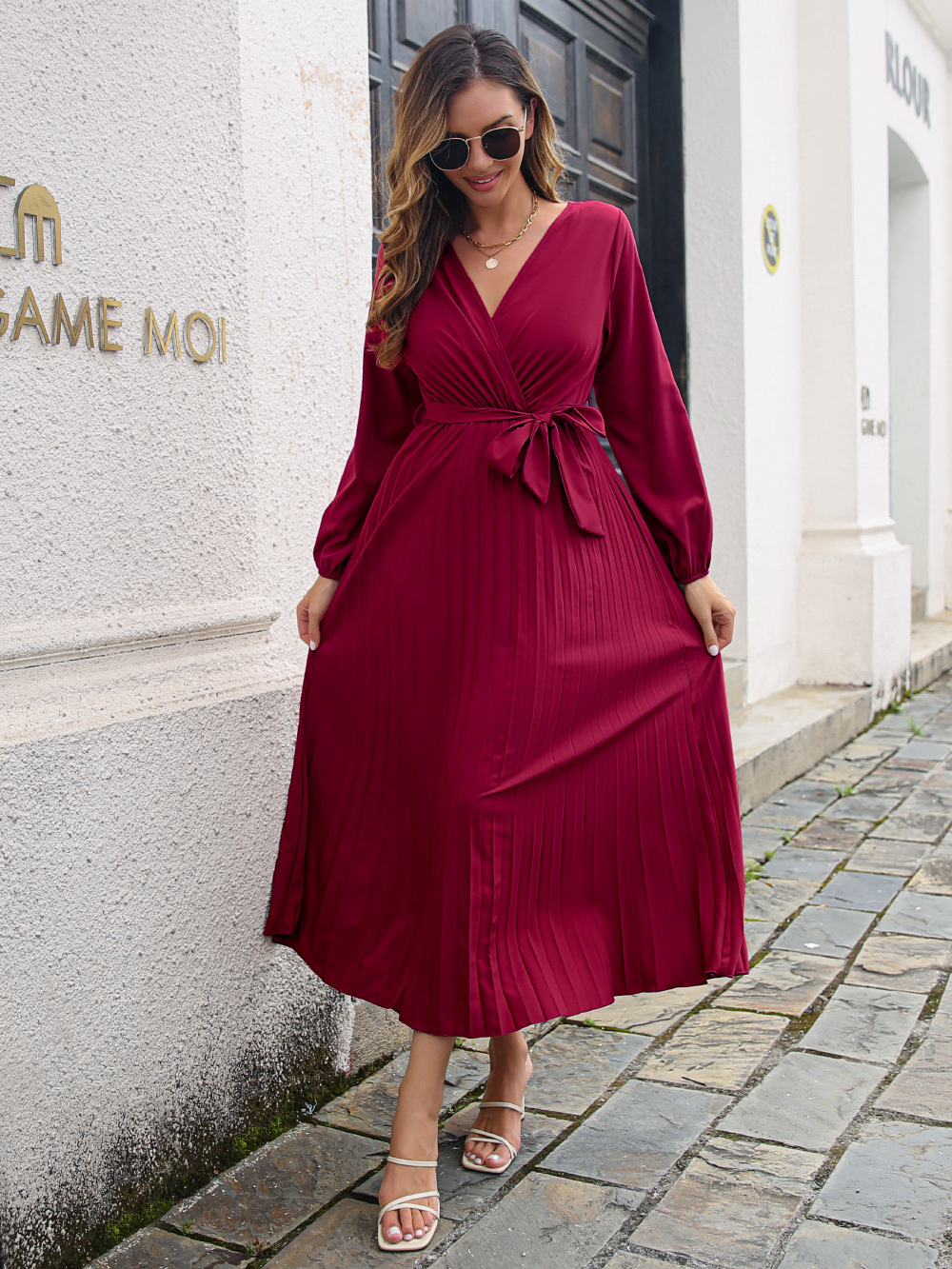 Women Clothing Autumn Winter Elegant Criss Cross V-neck Swing Pleated Dress Maxi Dress