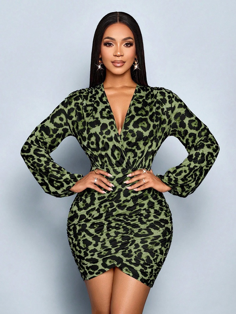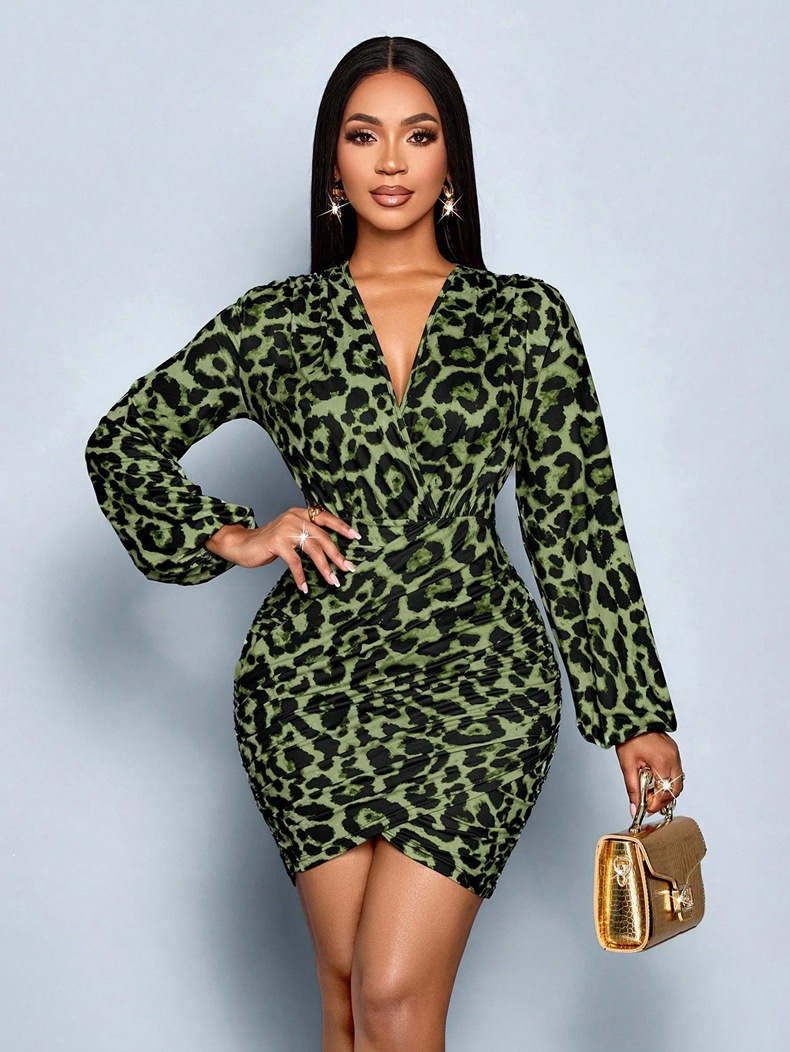 Women Clothing Autumn Winter Leopard Print Long Sleeve Dress Sexy Printed Satin Dress