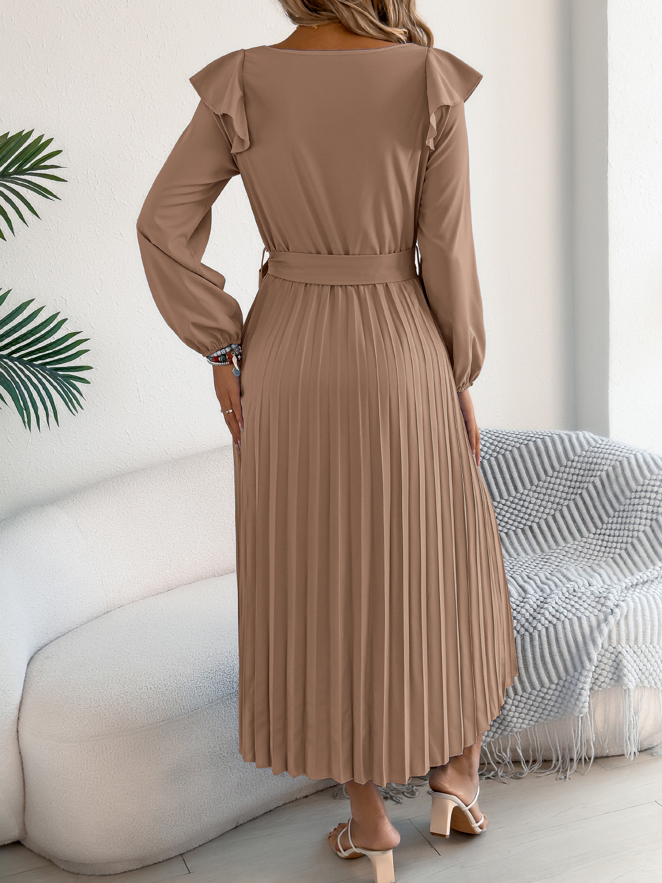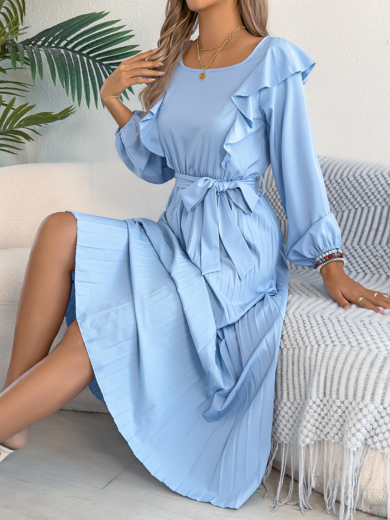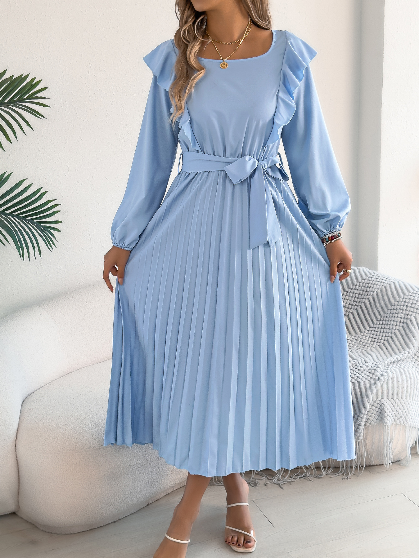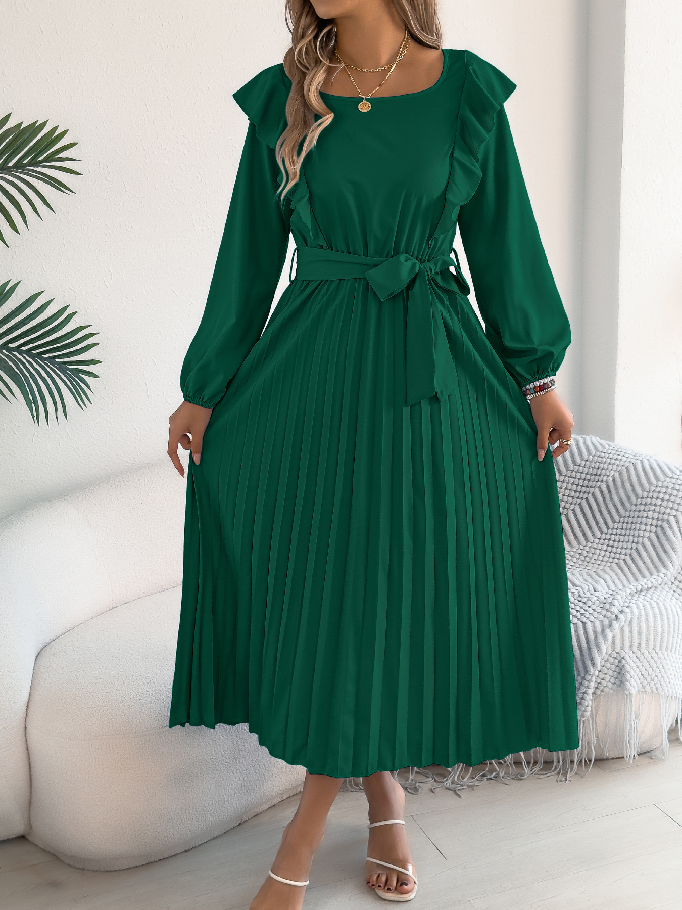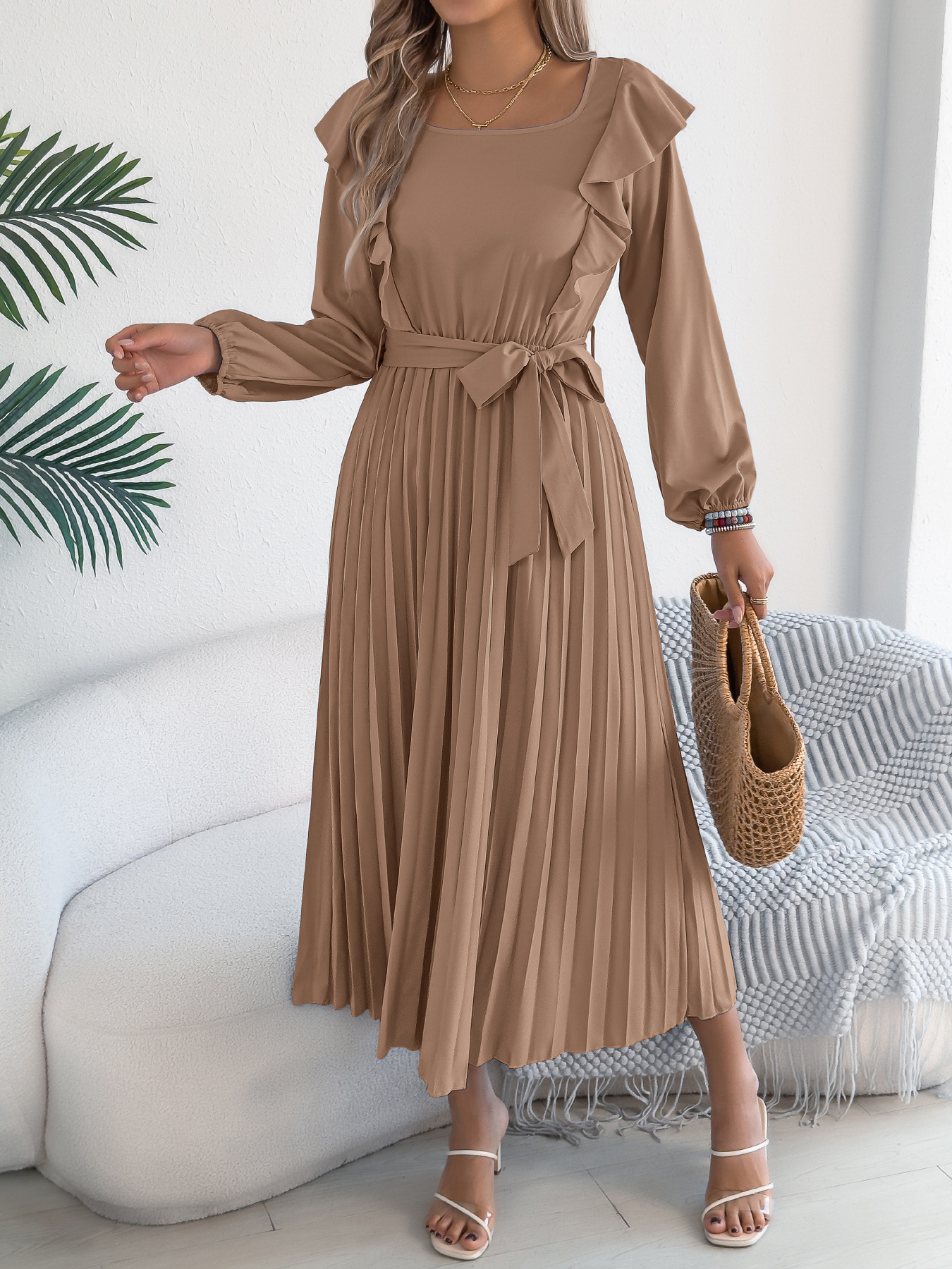 Women Clothing Spring Summer Elegant Ruffled Square Collar Long Sleeve Cinched Pleated Dress