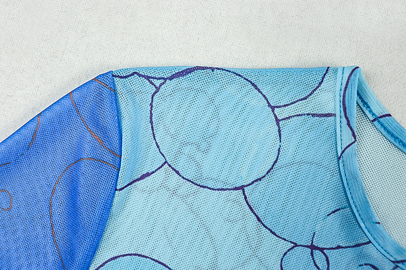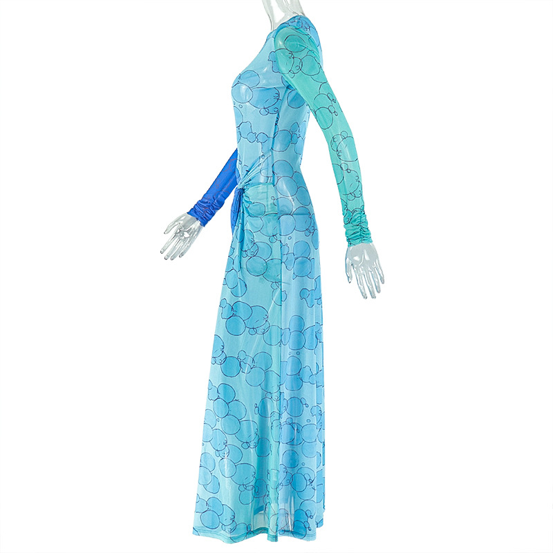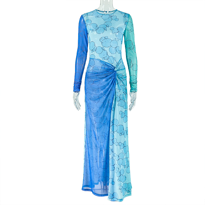 Women Clothing Waist Tight Socialite Slimming Hip Dress round Neck Print Long Sleeves Split Dress