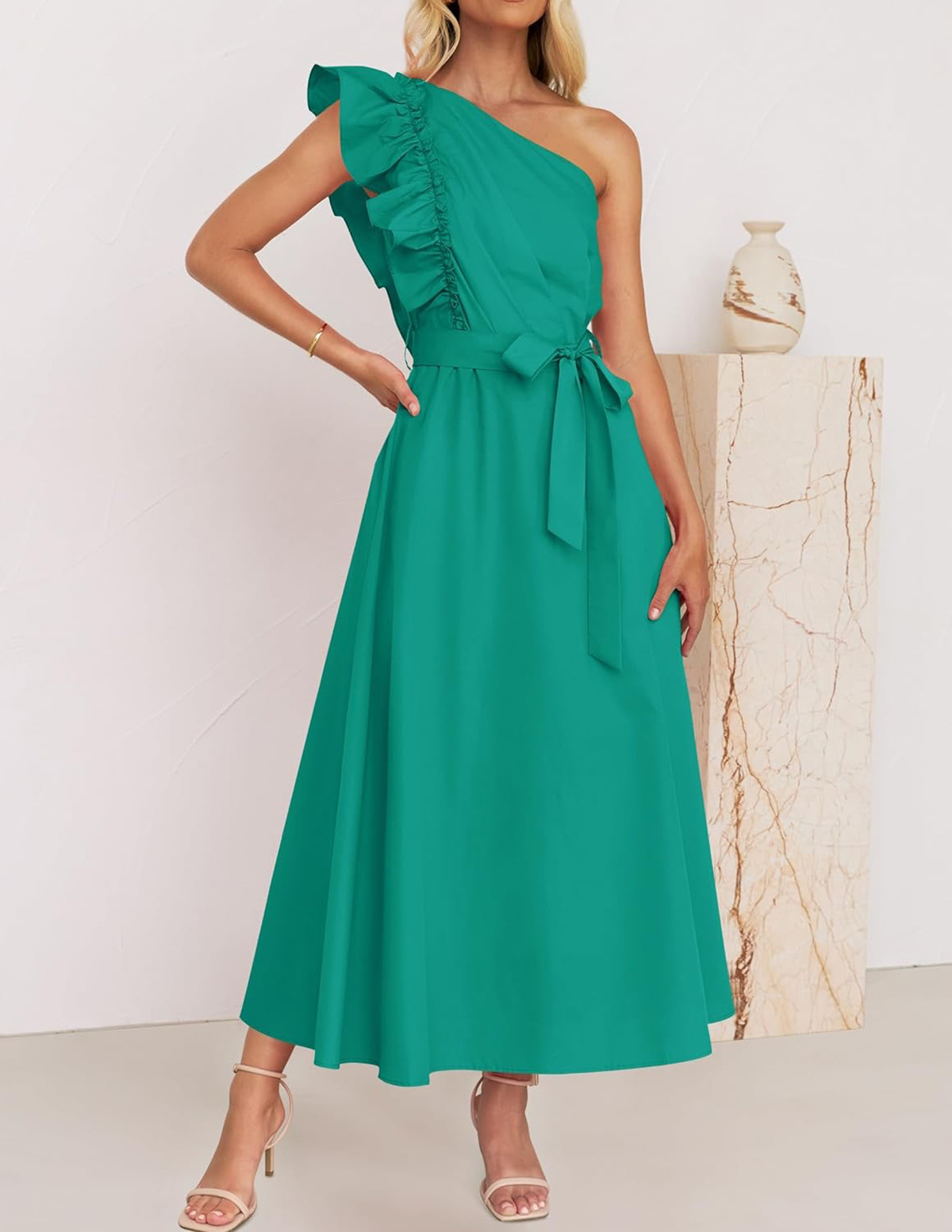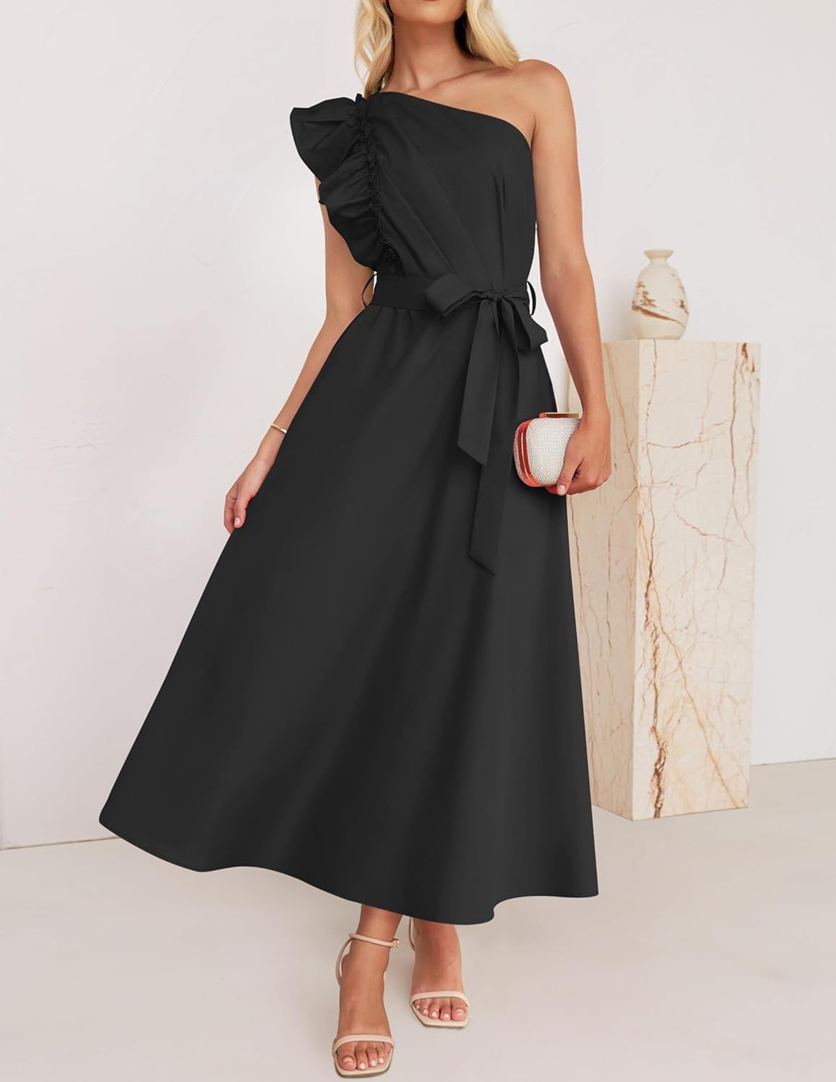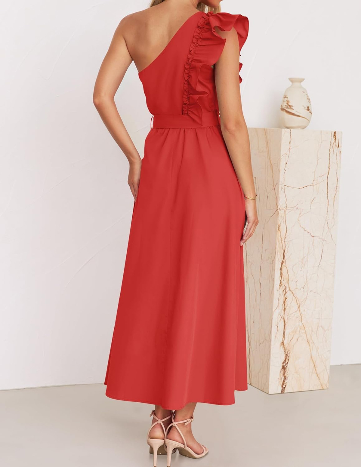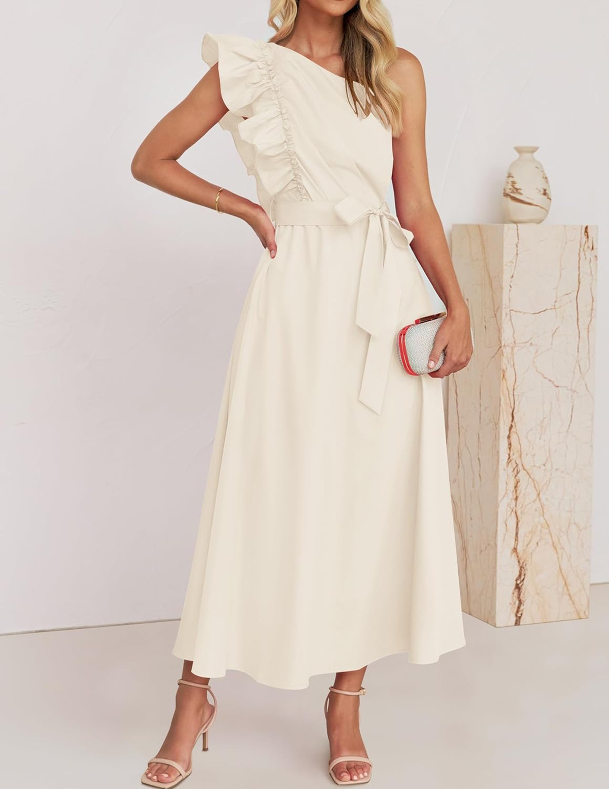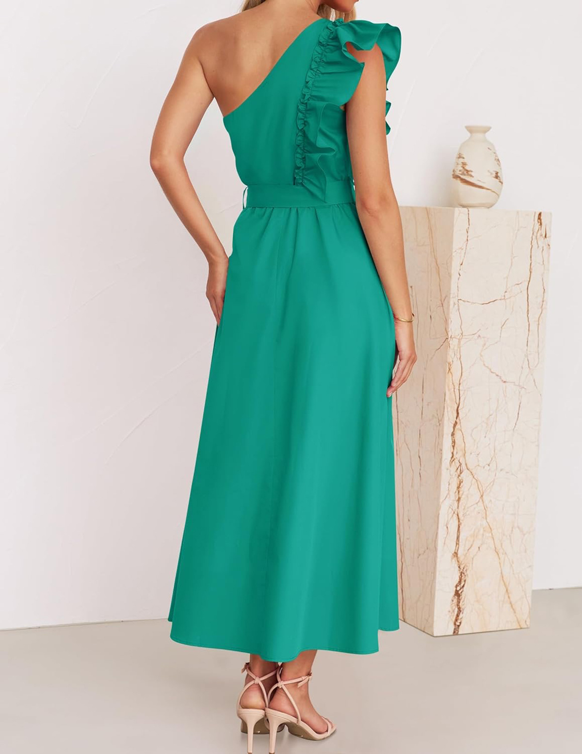 Women Maxi Dress Oblique Shoulder Wooden Ear Belt Dress Bridesmaid Toast Dress